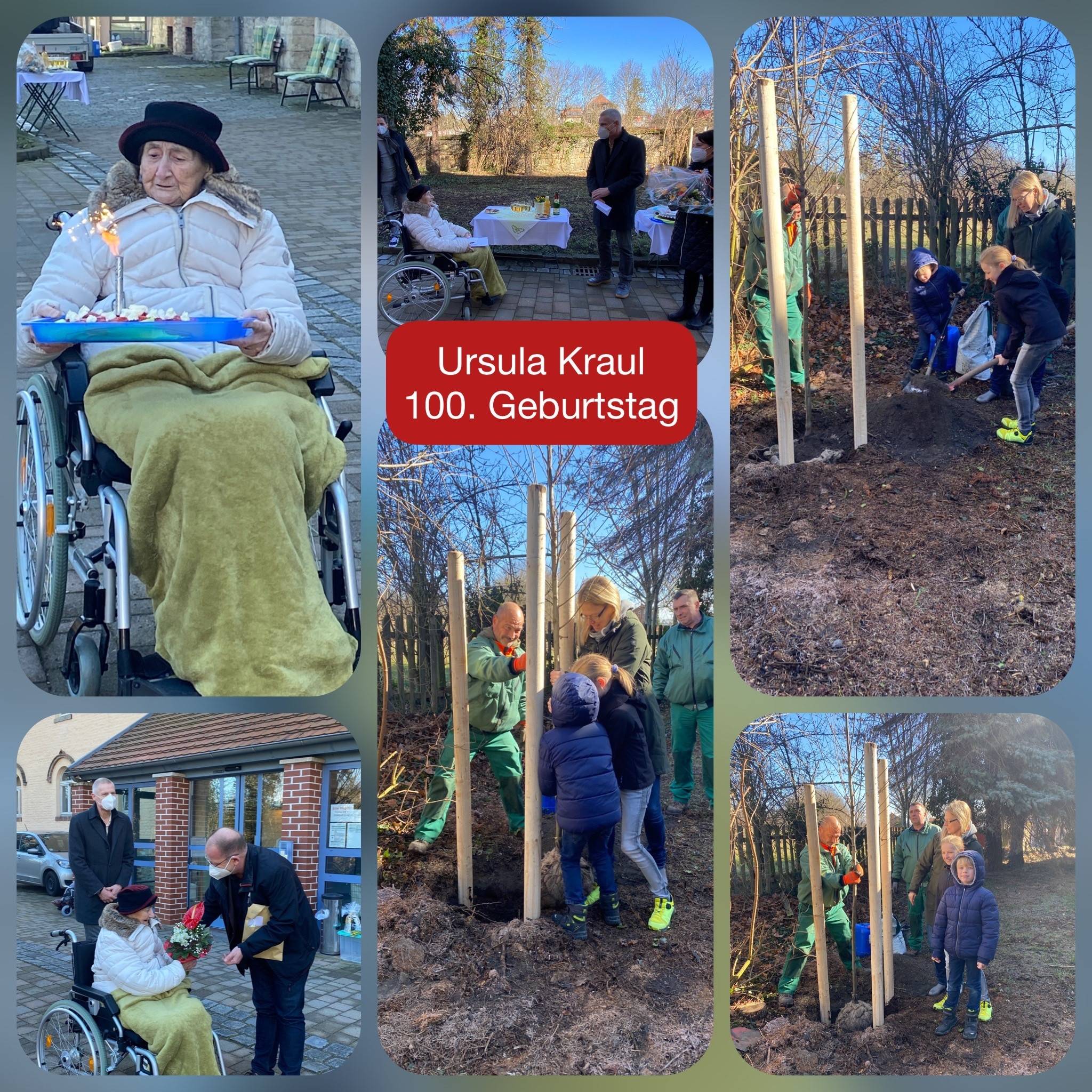 Ihre Urenkelkinder Lotte und Yannick, die extra aus Bonn angereist waren, pflanzten zu Ehren des 100. Geburtstag ihrer Uroma, gemeinsam mit ihrer Mutter Anne-Dore, der Enkelin von Frau Kraul, eine Felsenbirne auf dem Gelände des Seniorenheimes. Eine wunderbare Tradition im Cecilienstift.