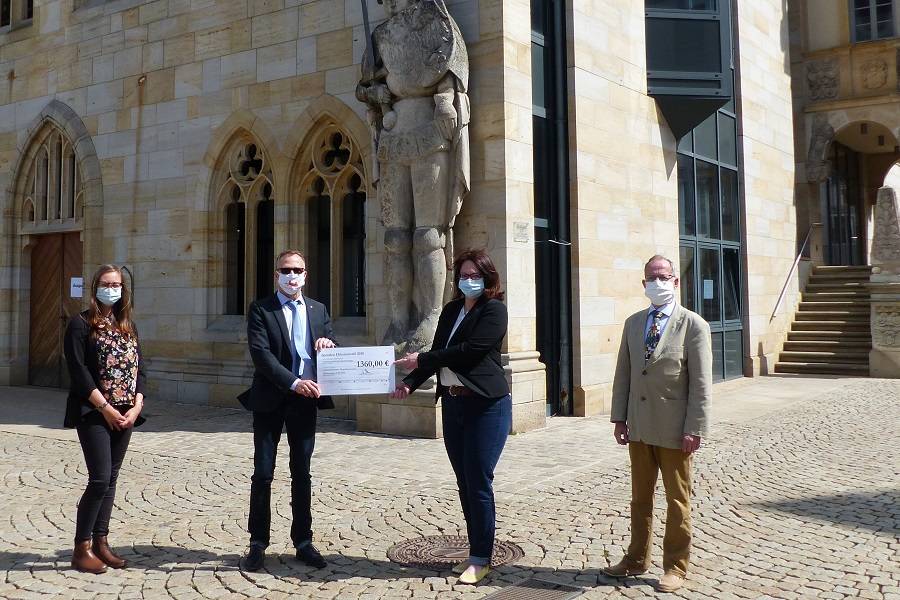 (von links) Carolin Timplan aus dem Büro für Gemeindeangelegenheiten der Stadt Halberstadt, das jedes Jahr das Hilariusmahl organisiert, Oberbürgermeister Andreas Henke, Britt Godisch, Vorsitzende des Storchenvereins Emersleben, und Stadtratspräsident Dr. Volker Bürger bei der Scheckübergabe vor dem Rathaus.