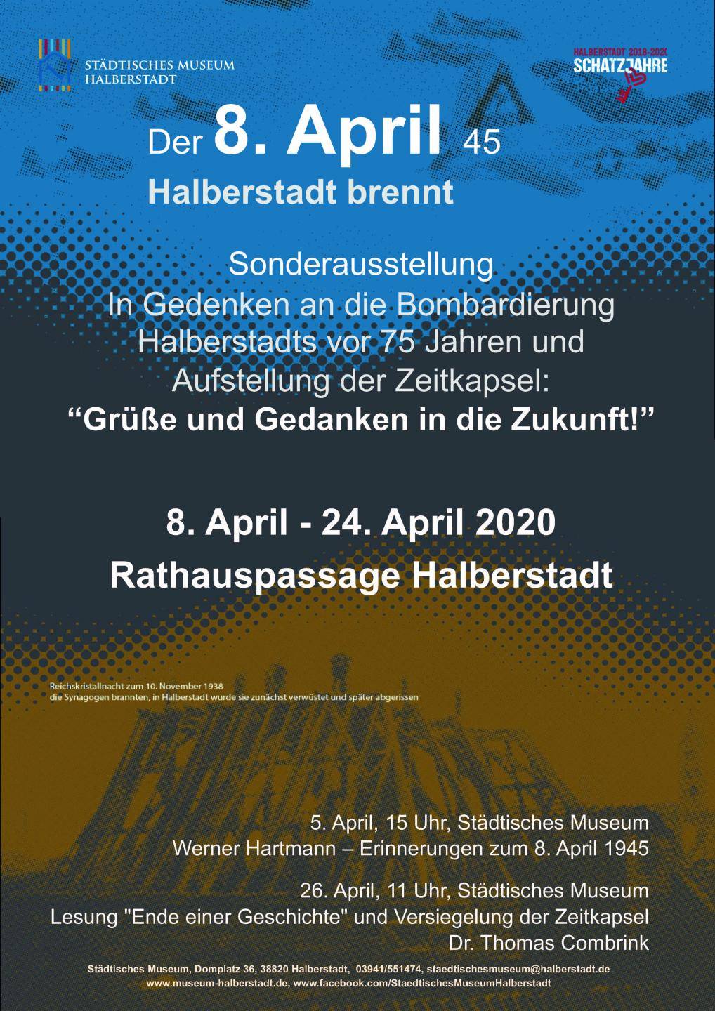 - In einer Sonderausstellung erinnert das Städtische Museum Halberstadt unter dem Titel. "Der 8. April 1945. Halberstadt brennt"an diesen Schicksalsschlag. Die Ausstellung wird vom 8. April bis zum 24. April 2020 in der Rathauspassage Halberstadt zu sehen sein.