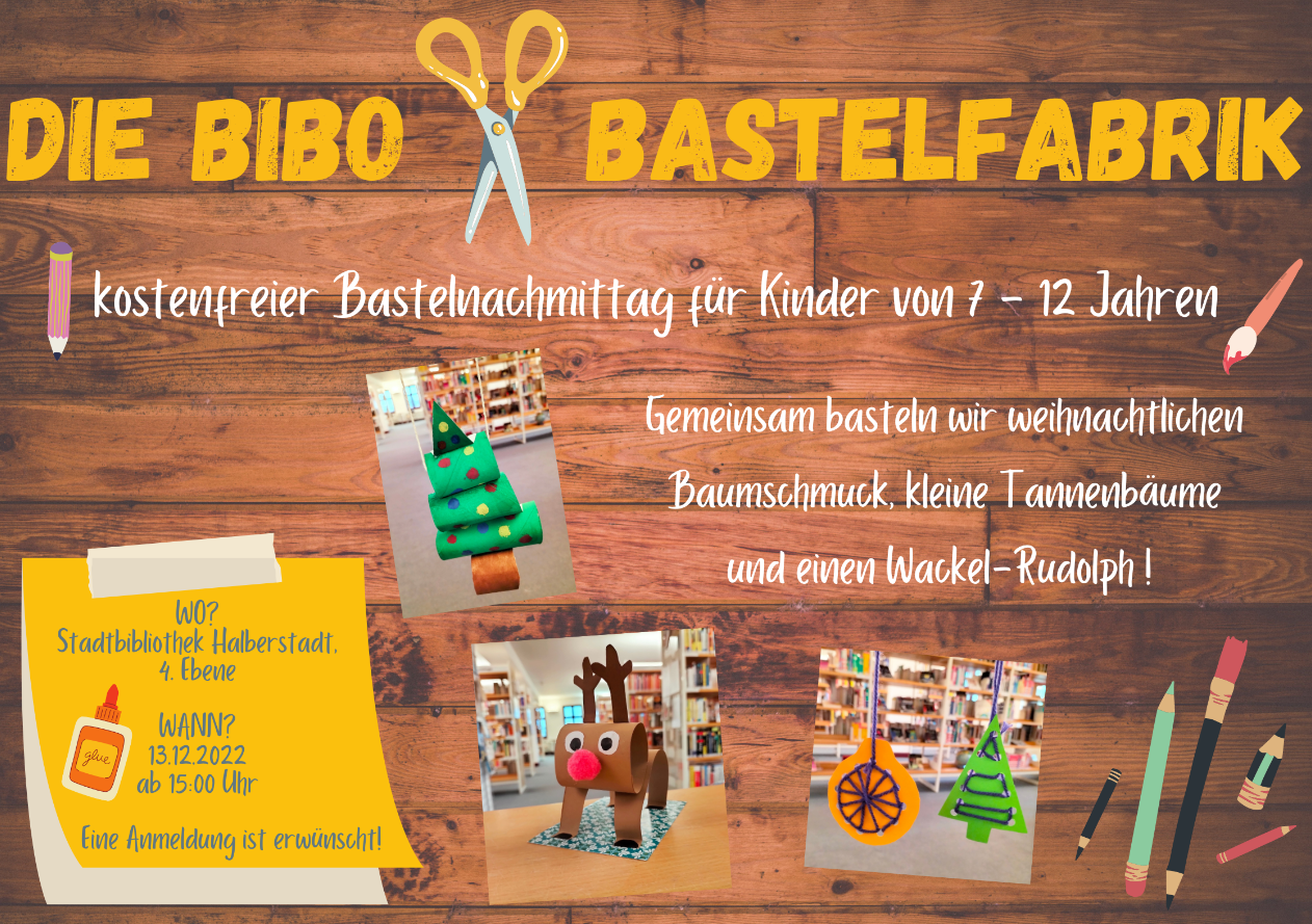HomeDie Bibo-Bastelfabrik steht am 13.12.2022 ganz im Zeichen des bevorstehenden Weihnachtsfestes. Kinder ab 7 Jahren können weihnachtlichen Baumschmuck, kleine Tannenbäume und einen lustigen Wackel-Rudolph basteln. Die Kreativität steht an diesem Nachmittag in der Halberstädter Stadtbibliothek ab 15.00 Uhr im Vordergrund. In gemütlicher Runde und unter sachkundiger Anleitung kommen so auch kleine ungeübte Hände zum Erfolg.