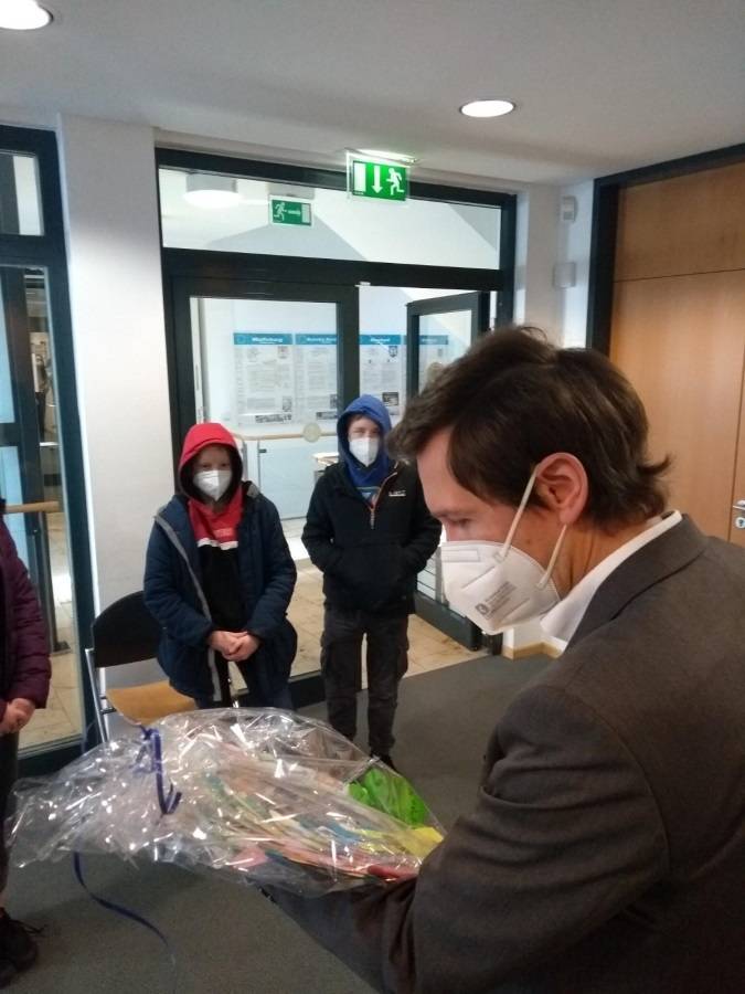 Der unerwartete Besuch im Rathaus hat den Oberbürgermeister sichtlich überrascht und erfreut. „Ich habe mich sehr über die Glückwünsche der Kinder und Jugendlichen gefreut. Ihr Geschenk hat schon einen schönen Platz in meinem Büro gefunden.“ fasst Daniel Szarata das kurze Treffen zusammen.