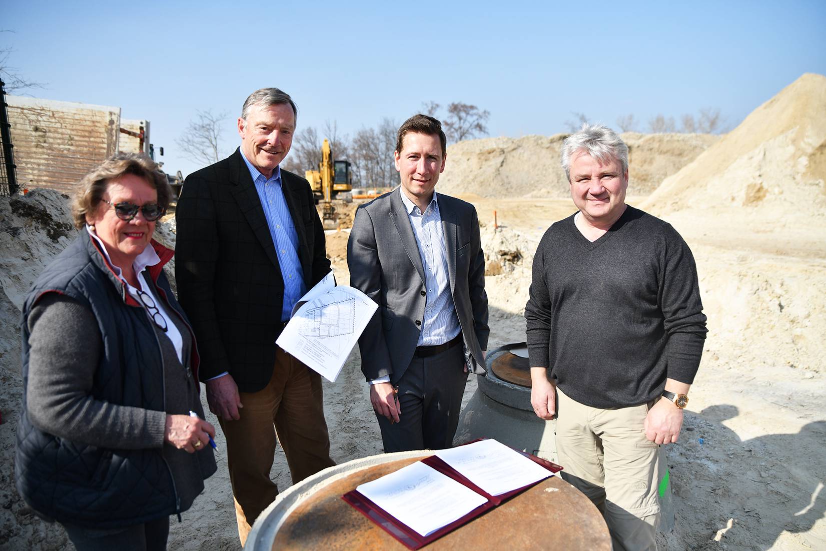 Text: Cordula und Wolf von Rhade, Oberbürgermeister Daniel Szarata und Ortsbürgermeister Holger Werkmeister freuen sich über das neue Baugebiet in Langenstein