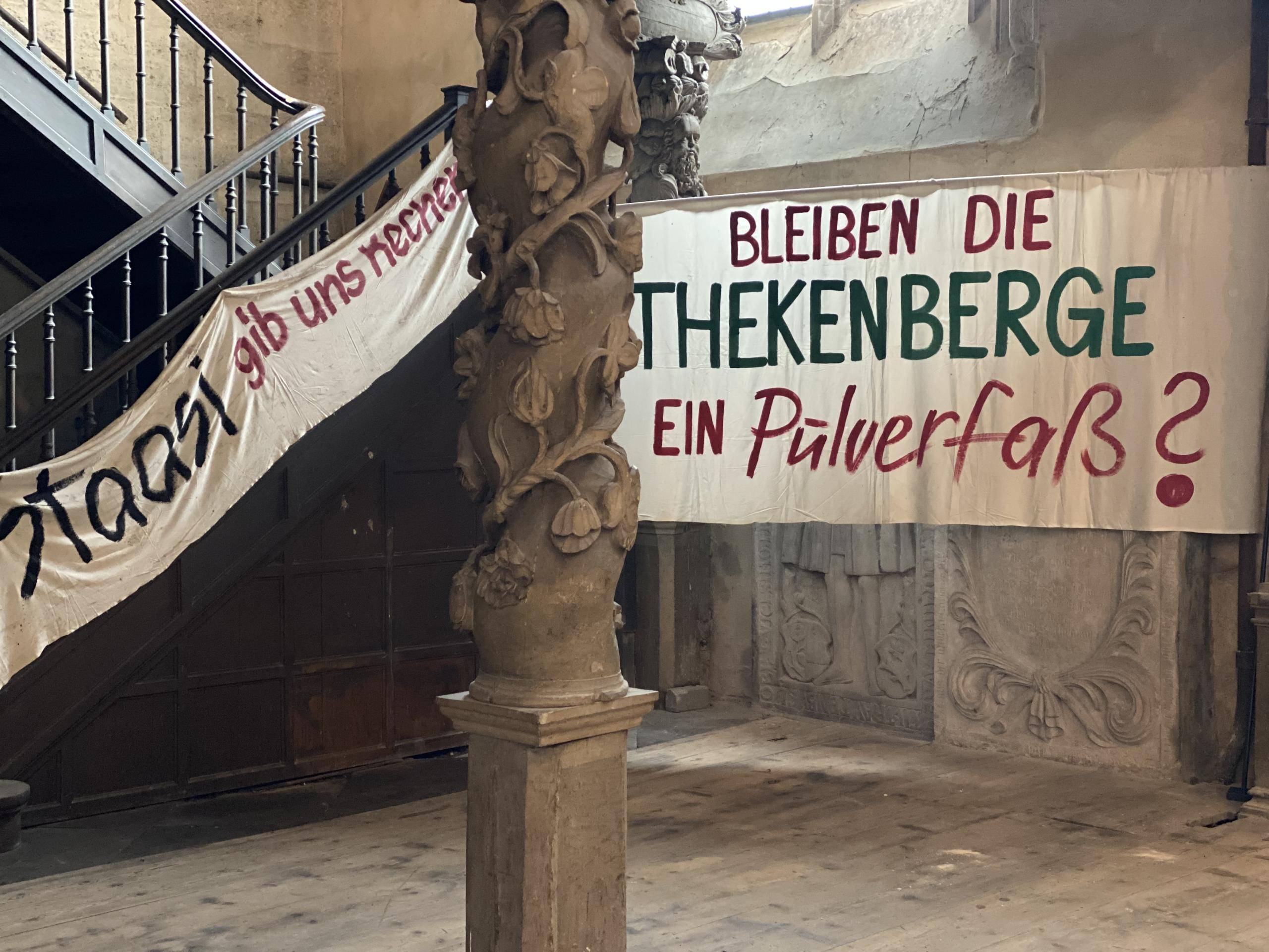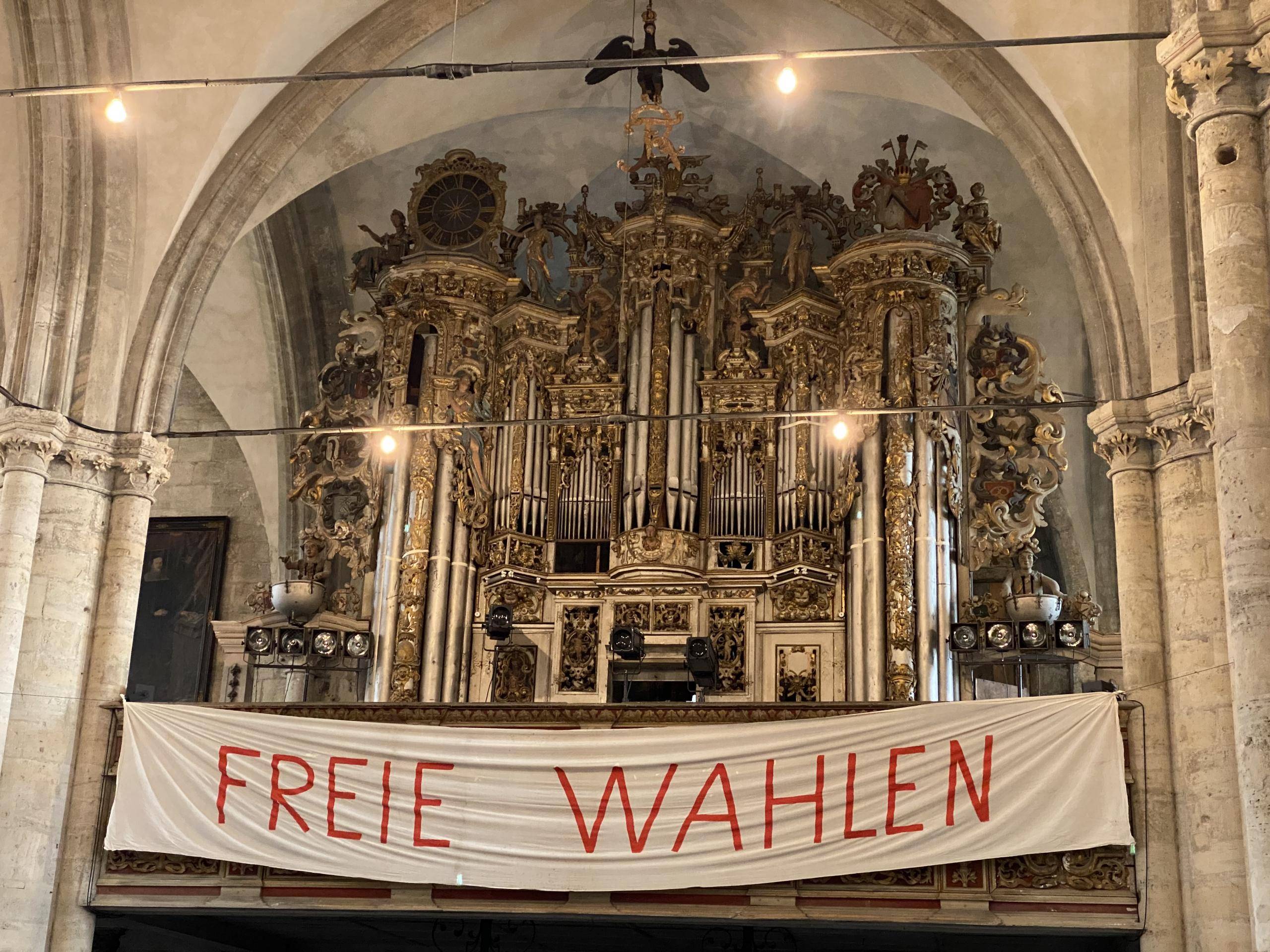 Nun sind ausgewählte Banner, die provisorisch auf Bett- und Tischtücher geschrieben wurden, an ihren ursprünglichen Ort in der Martinikirche zurückgekehrt.