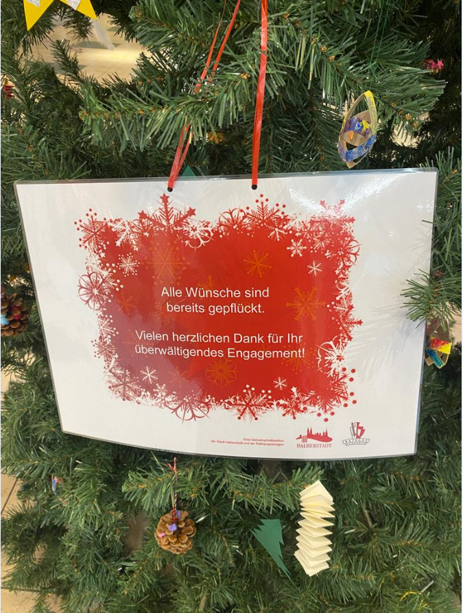 Die diesjährige Bescherung am Wunschweihnachtsbaum findet am 15. Dezember um 15 Uhr in den Rathauspassagen Halberstadt in Anwesenheit von Oberbürgermeister Daniel Szarata und Centermanager Enrico Burau statt.