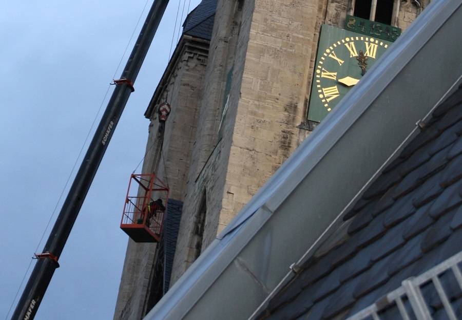 HomeMitarbeiter der Dachdeckerfirma Neumann aus Hadmersleben und der Halberstädter Firma Schäfer Kran- und Transportlogistik GmbH & Co.KG reparieren das Dach zwischen den beiden Türmen der Martinikirche. Ein etwa 2 Meter langes Kupferblech hatte sich durch starken Wind gelöst und drohte herunterzufallen. Der Sturmschaden ist ein Versicherungsfall, wodurch die Reparaturkosten nicht den Haushalt der Stadt belasten.