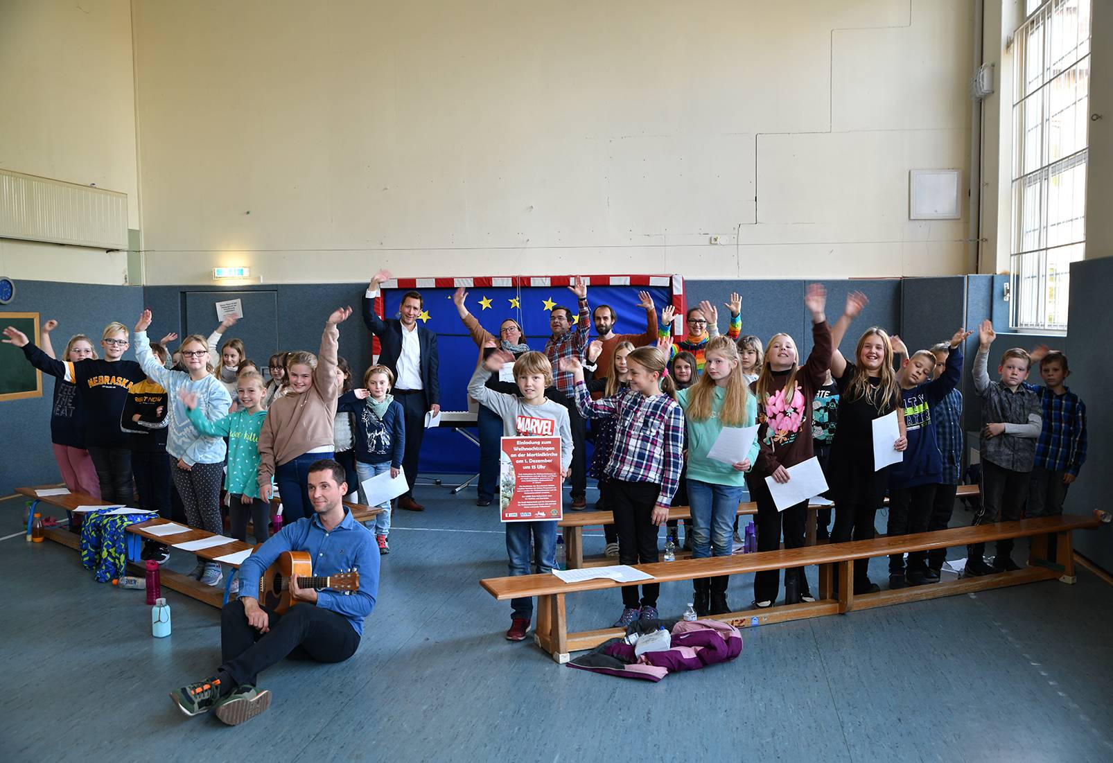 In rekordverdächtiger Zeit entstanden Noten und ein Textgerüst. Diese wurden heute von Oberbürgermeister Daniel Szarata dem Hort der Miriam Lundner Grundschule symbolisch für alle Einrichtungen übergeben. Schulleiter Sebastian Lütgert, Hortleiterin Stephanie Künzl, Torsten Volkmann und Andrea Bekuhrs konnten mit den Kindern bereits proben und trugen stolz die erste Strophe des Liedes samt Refrain vor.