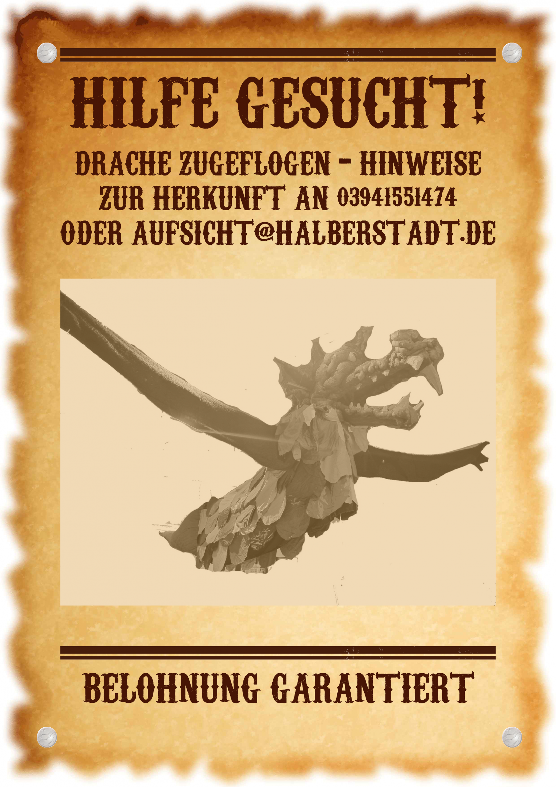 Wer also sachdienliche Hinweise zur Herkunft unseres Drachens besitzt, sollte diese so schnell wie möglich an unsere Museumsdienststelle unter 03941/551474 oder per Email an aufsicht@halberstadt.de melden.