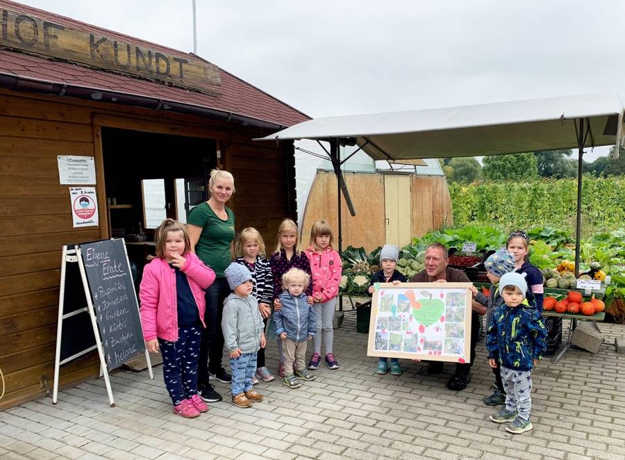 Gemeinsam mit Familie Kundt entdecken sie die Obstplantagen zu Fuß oder im Hänger mit dem Traktor, besichtigen die Gemüsezelte und halfen auch bei der Ernte vom Kirschen und Äpfeln. Nicht jede Kirsche oder jeder Apfel landet dann im Körbchen, sondern auch in einem kleinen Bauch. Die gesammelten Äpfel wurden anschließend gleich gepresst und alle haben den frischen Apfelsaft verkostet. Alle sind begeistert gewesen - und es hat köstlich geschmeckt.