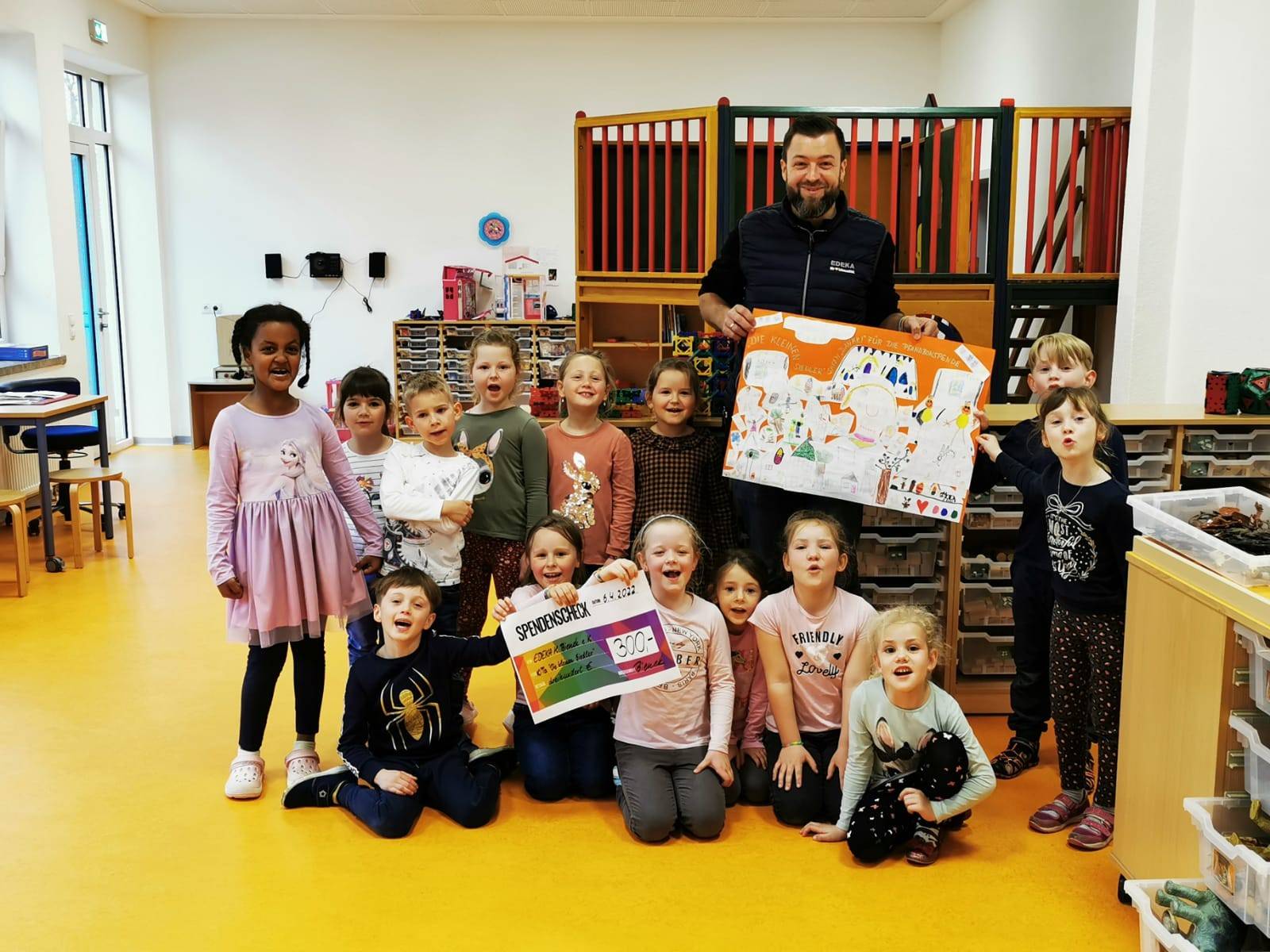Herr Bienek übergab den Kindern einen Spendenscheck über 300,- Euro für ihre Einrichtung.