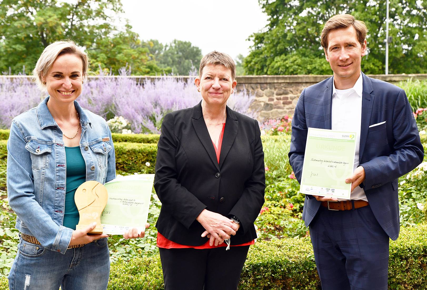 Oberbürgermeister Daniel Szarata und Katja Klein vom Verein Halberstädter Berge erhielten am 14. Juli in Magdeburg aus den Händen von Umweltministerin, Prof. Dr. Claudia Dalbert, sowie des Vorstandsvorsitzenden, Dr. Willy Boß, und der Geschäftsführerin, Dr. Nele Herkt, von der SUNK den 1. Hauptpreis.