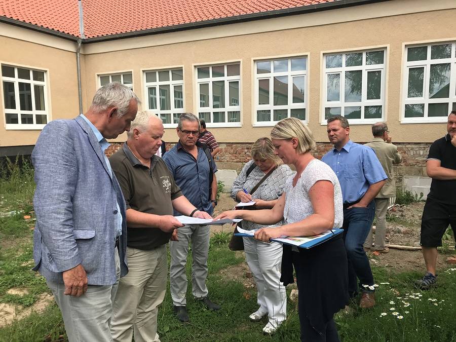 HomeErneut fand am 30. Juni auf Einladung der Stadt eine Begehung der Baustelle Diesterwegschule in der Sargstedter Siedlung statt. Halberstädter Stadträte und Medienvertreter sind dieser Einladung gern gefolgt, um sich zusammen mit Oberbürgermeister Andreas Henke ein Bild über Stand der Bauarbeiten auf der derzeit größten Baustelle der Stadt zu verschaffen. Die Baustellenführung lag in den Händen von Sylvia Schumann vom Architekturbüro Kirchner + Przyborowski, Jörg Wolansky, Abteilungsleiter Hochbau und sein Mitarbeiter Volker Bolze.