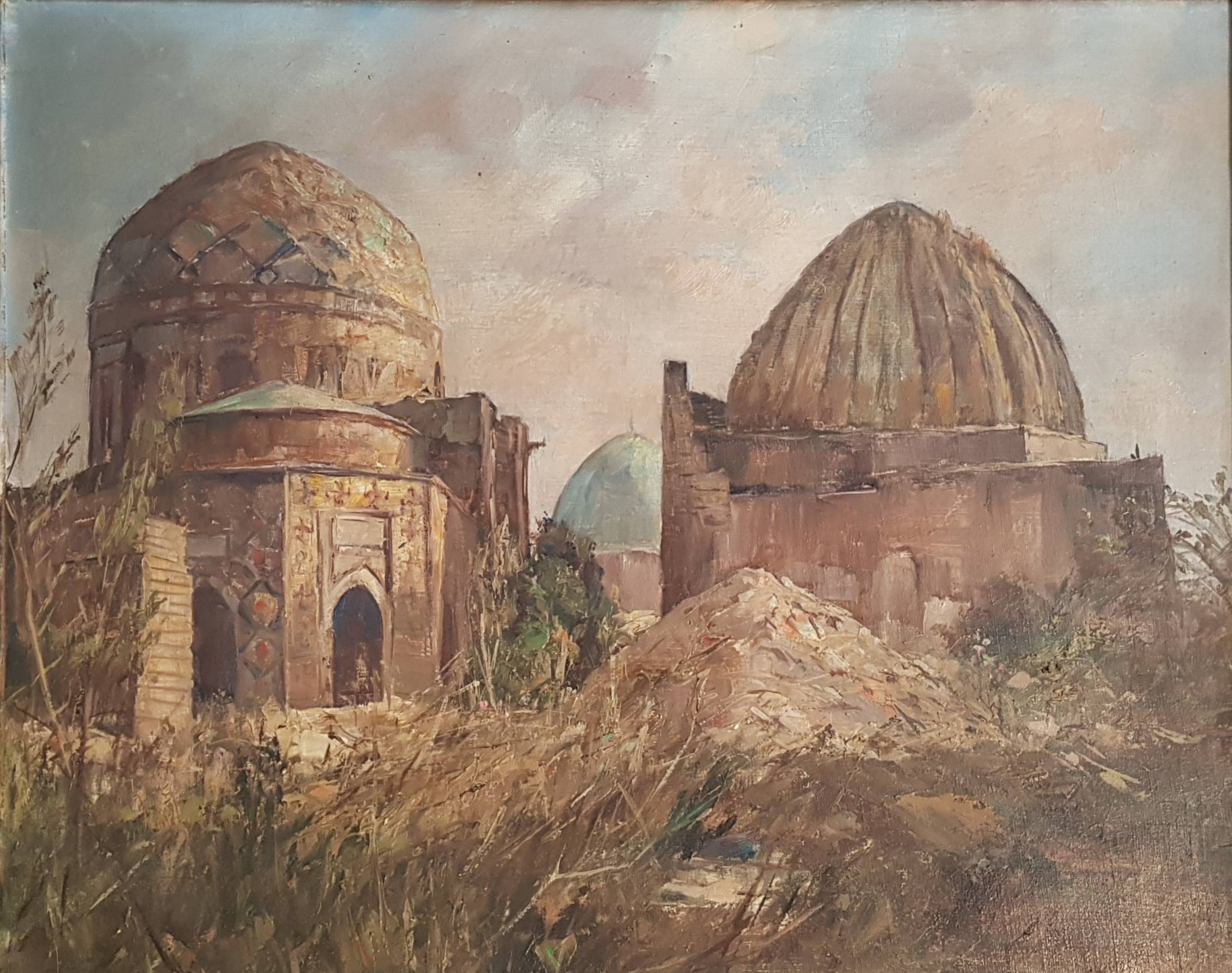 Es zeigt ein, im Gegensatz zu anderen Werken des Künstler, ungewöhnliches Motiv, das sicher nur ein einziges Mal von ihm gemalt wurde, die Gräberstraße Schah-i-Sinda.