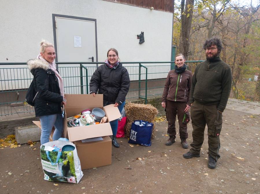 Warum die zwei engagierten Damen so viel Gutes für die Fundtierunterkunft tun erklärte Sandy Schock mit den Worten: „Wir waren vor einem Jahr bereits hier und übergaben eine Spende an das Katzenhaus, und wir sind so begeistert von der Arbeit hier, dass wir das wieder tun wollten. Die Spenden sind 1/10 einer großen Spendenaktion für Hunde in Rumänien. Vieles davon ist für rumänische Straßenhunde einfach nicht verwendbar“. Tiergartenleiter David Neubert erklärte daraufhin: „Aber es ist eine wunderbare Hilfe für die Fundtierunterkunft Halberstadt“. Tine Böer zeigte daraufhin den Spenderinnen die aktuellen Fundtiere der Fundtierunterkunft Hunde. Die ersten Leckerlies konnten die zwei Frauen sofort dem Mischlingshund Odin bringen, welcher sich mit energischem Spielen bedankte. Nach dem Toben versprachen beide Frauen zum Abschied, dass sie in einem Jahr wahrscheinlich wiederkommen werden.