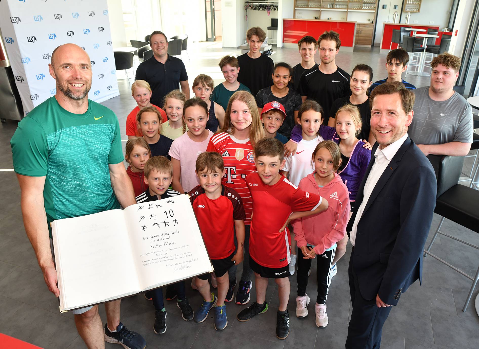 Dieser Erfolg war Grund genug, Steffen Fricke nun im Training im Friedensstadion zu überraschen. In Anwesenheit von Germania-Vizepräsident Bastian Herbst und weiteren Vereinsfreunden wurde er von Oberbürgermeister Daniel Szarata gebeten, sich in das Goldene Buch der Stadt einzutragen. Wieder einmal, denn als „Persönlichkeit des Jahres“ wurde er bereits 2019 für seine Erfolge im Leistungssport als Zehnkämpfer und Nachwuchstrainer ausgezeichnet.