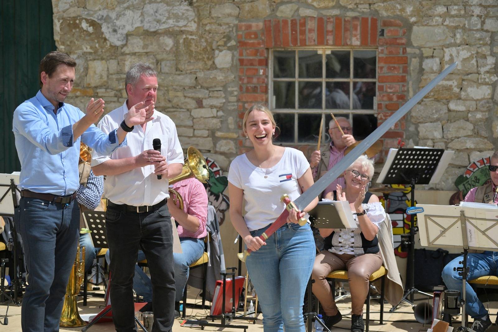 „Es ist doch toll, was die Mitglieder unseres Festkomitees geleistet haben“, sagte er. Der Treffpunkt auf dem Gutshof habe sich als sehr anziehend erwiesen, stellte er auch am Sonntagvormittag fest. Gemeinsam mit Halberstadts Oberbürgermeister Daniel Szarata startete hier das Fest der Vereine. So hatten sich der Storchenverein, die Kegelfreunde, die Schützen, aber auch Kleintierzüchter und die Mitglieder der Freiwilligen Feuerwehr Emersleben einige „Ritterspiele“ einfallen lassen und wer die meisten Punkte schaffte, sollte zum Ritter gekürt werden. Am erfolgreichsten zeigte sich dabei Marie Böwing, die wohlverdient von Daniel Szarata zur „Ritterin von Emersleben“ erhoben wurde. Dass passende Schwert dazu stellte Marco Weiß zur Verfügung.