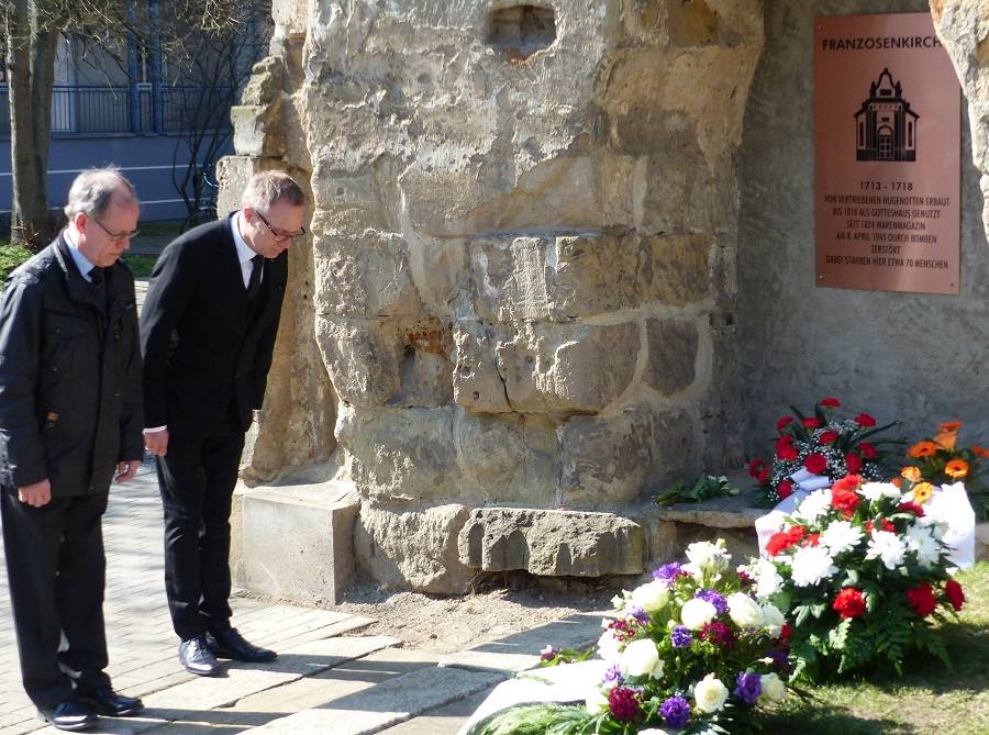 Oberbürgermeister Andreas Henke: „Stellvertretend für all jene, die heute mit uns an der Franzosenkirche innehalten wollten, darf ich unsere Ehrenbürger nennen: Schwester Ursula Sommer, unseren Stadtchronisten Werner Hartmann und den Autor und Filmemacher Prof. Alexander Kluge, der sich in besonderer Weise mit seinem künstlerischen Großprojekt `Die Macht der Musik und den Halberstädter Friedensfenstern` dem Erinnern, dem Bewusstmachen und Mahnen verschrieben hat. Ebenso wie Werner Hartmann, der sich mit seiner jüngsten zweiten überarbeiteten Auflage von „Halberstadt brennt“ einer sachlich fundierten und akribisch recherchierten Dokumentation des Bombenangriffs widmete. Beiden, Werner Hartmann und Alexander Kluge, ist überaus wichtig, mit ihren Inhalten und Botschaften besonders jene zu erreichen, die noch einen Großteil ihres Lebens vor sich haben. Die Ruine der Franzosenkirche ist heute unser mahnendes Zeichen. Nie wieder sollen Menschen unserer Stadt und anderer Städte der Welt solch ein Kriegstrauma erleben müssen. Friedfertigkeit und Mitmenschlichkeit, Solidarität und Verständigung sind unser Gebot und gleichsam auch Verpflichtung. Lassen Sie uns darin gemeinsam zusammenstehen für ein friedliches Halberstadt, für eine friedliche Welt.“