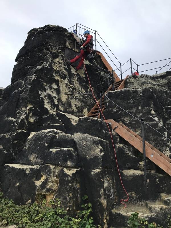 HomeAm Mittwoch vor einer Woche haben Mitarbeiter der Fa. Green Alpin aus Ilsenburg im Auftrag des Vereins Halberstädter Berge e.V. die Gedenktafel am Gläsernen Mönch demontiert. Die Tafel erinnert an den Oberbürgermeister Becker, der vor mehr als 100 Jahren die Thekenberge aufforsten ließ. Die Tafel soll nun gesäubert, mit einem neuen Schutzanstrich versehen und dann wieder am Felsen befestigt werden.