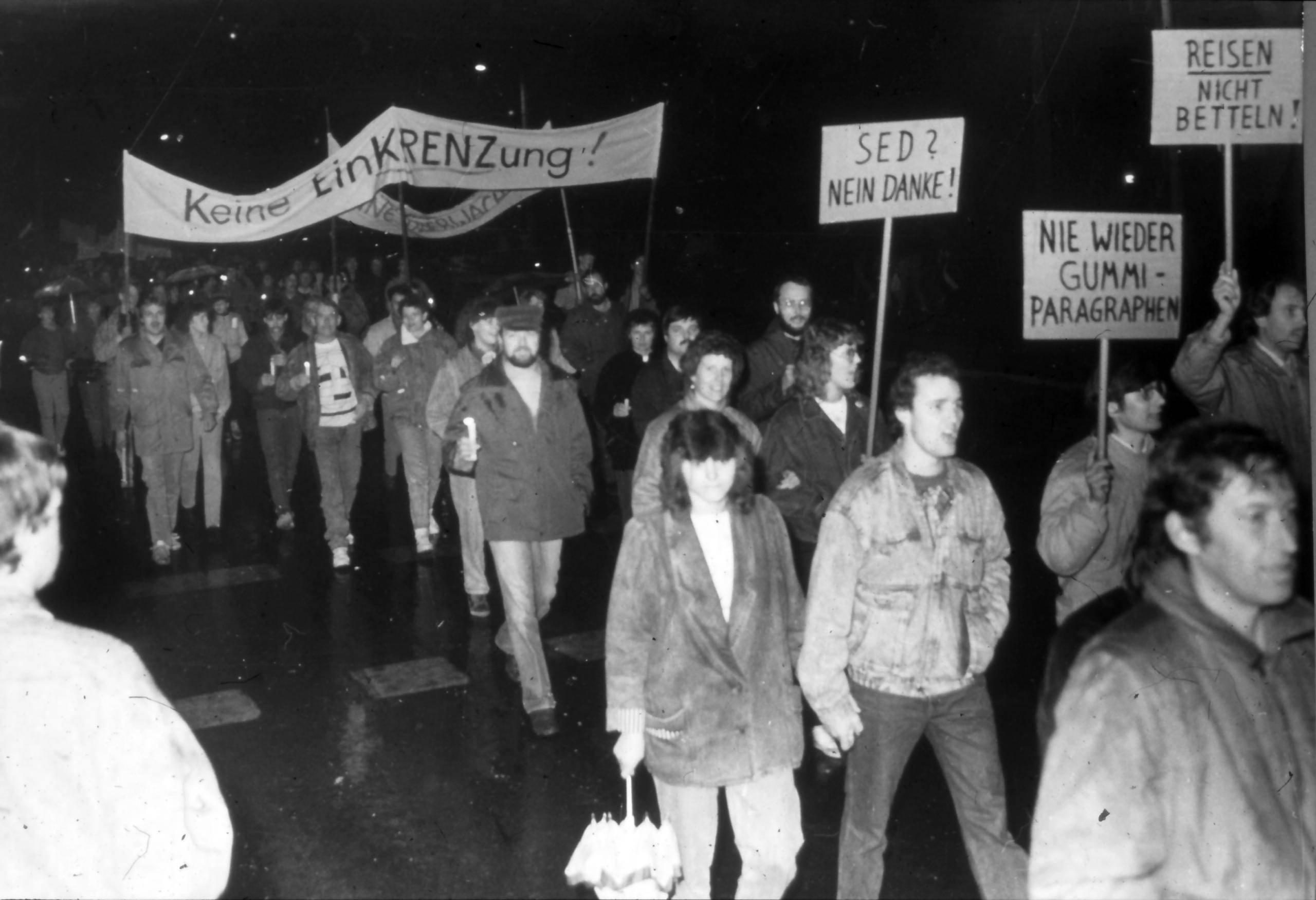Nun, 35 Jahre nach den Ereignissen, kehren ausgewählte Banner, die provisorisch auf Bett- und Tischtücher geschrieben wurden, an ihren ursprünglichen Ort in der Martinikirche zurück. Das verstärkt ihre Wirkung auf den heutigen Betrachter.