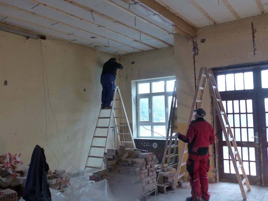 HomeAm 27. September 2018 wurde der erste Spatenstich für die Sanierung der Grundschule Diesterweg feierlich vollzogen. Bis zum heutigen Zeitpunkt sind ein Großteil der Bau- und Installationsarbeiten erfolgt. Dach und Dämmung sind erledigt, der Außenputz am gesamten Gebäude ist fertiggestellt. Die Innenausbauarbeiten sind in vollem Gange: Derzeit wird der Fußbodenestrich in den Räumen und Fluren gegossen, die Fußbodenheizung in den Bauteilen Kinderkrippe und Kindergarten ist verlegt. Die Heizkesselanlage steht und ist funktionsbereit. Heizung und Sanitär sind vorbereitet. Elektroarbeiten laufen.