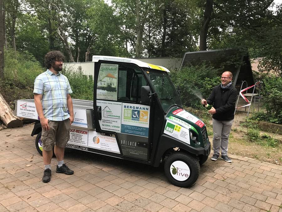 HomeSeit vergangener Woche Donnerstag besitzt unser Tiergarten ein neues Elektrofahrzeug. 32 Firmen aus Halberstadt und Umgebung haben dieses Fahrzeug gesponsert – viele von ihnen waren bei der offiziellen Übergabe dabei. Die Organisation für die Sponsoring-Aktion lag in den Händen der Firma BrunnerMobil. Das Elektrofahrzeug wird zukünftig als Transportfahrzeug und Fahrzeug für täglich anfallende Aufgaben im Einsatz sein. Es fährt 20 km/h und kann 300 Kilogramm transportieren. Timo Günther, hatte das Elektrofahrzeug in Vertretung von Oberbürgermeister Andreas Henke offiziell in den Dienst gestellt. Dazu gab es eine kleine Sekttaufe und dankende Worte an die Sponsoren. Die Namen der Sponsoren sind auf einer Liste am Kassenhäuschen aufgeführt.