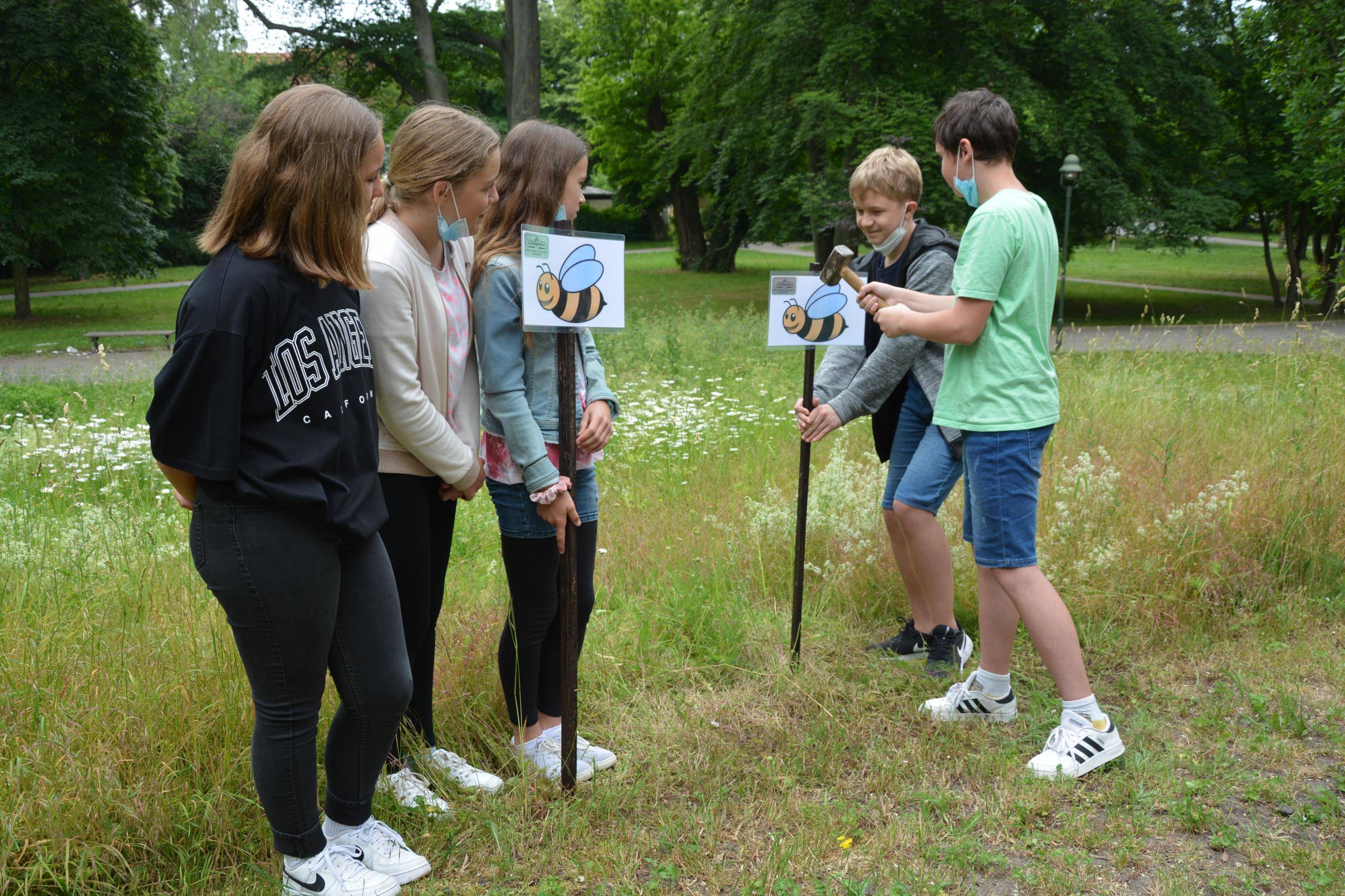 Weshalb nun die „neuen“ Sechstklässler die Pins in die Erde setzen, die ihre Vorgänger im vergangenen Jahr entworfen hatten. Im Rahmen ihres mehrjährigen Projektes „nachhaltig.mitmachen“ hatten Schüler viele Ideen, wie die Hinweise aussehen könnten.