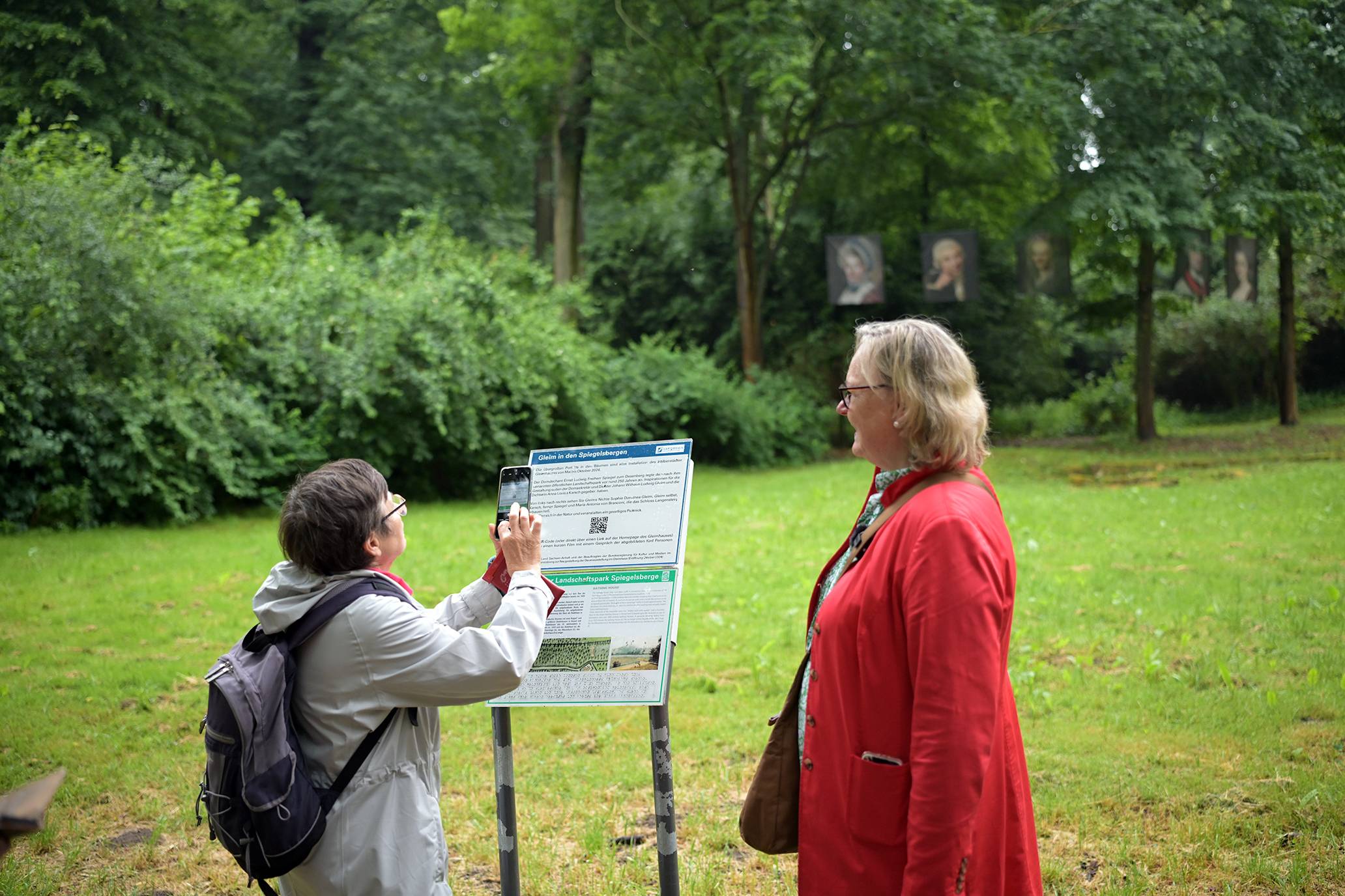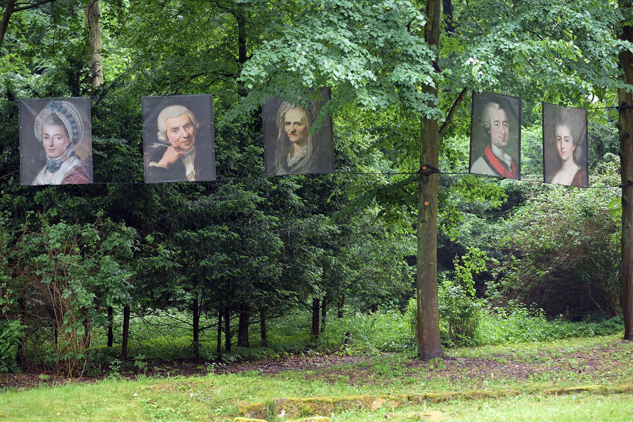 Zwei Mitarbeiter der Firma green alpin Baumpflege & Seilklettertechnik GmbH hängten die Bilder im Format 1.50m hoch und 1.20m breit in den Bäumen auf. Ähnlich der Bildergalerie im Gleimhaus wollen die fünf Outdoor Porträts zum Nachdenken über den Netzwerker Gleim und seine Zeit einladen. Inspirierende Unterstützung bietet ein kleiner Film, der mittels eines QR -Codes vor Ort beim ehemaligen Badehaus beziehungsweise über die Homepage des Gleimhauses abgerufen werden kann. Hergestellt wurde der Film von Anica Lindig (IdeenGut GmbH & Co. KG), die die Porträtierten animiert und einen kurzweiligen Film hergestellt hat.