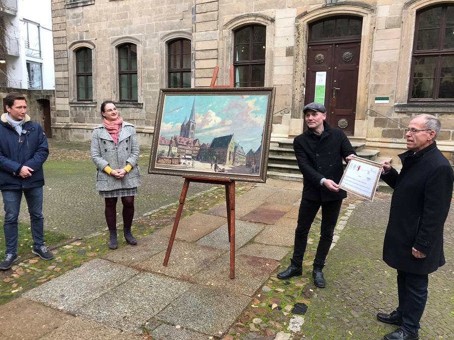 HomeGroße Freude in Halberstadt. Heute (26. November 2020) übergab Christian Vechtel vom Auktions- und Antiquitätengeschäft Zeitgenossen Münster ein in Halberstadt bis dahin unbekanntes Walter-Gemm-Gemälde mit einer Holzmarktansicht aus dem Jahr 1930 an das Städtische Museum. Entgegengenommen haben es Dr. Antje J. Gornig, Direktorin des Städtischen Museums, Daniel Szarata, Landtagsabgeordneter und Stadtrat, und Dr. Volker Bürger, Vorsitzender des Halberstädter Geschichtsvereins, die Initiatoren der grandiosen Spendensammlung zum Erwerb des Bildes.