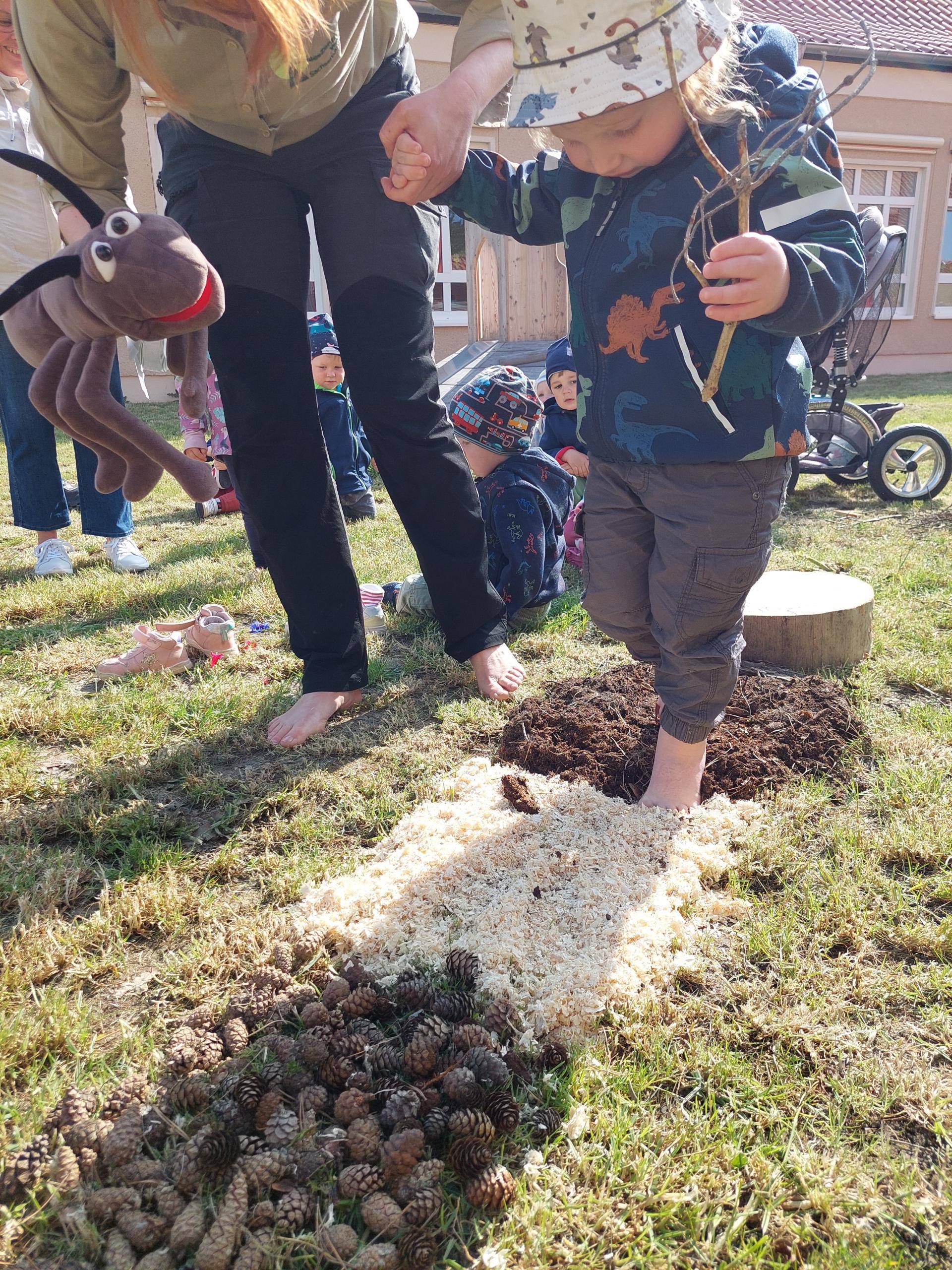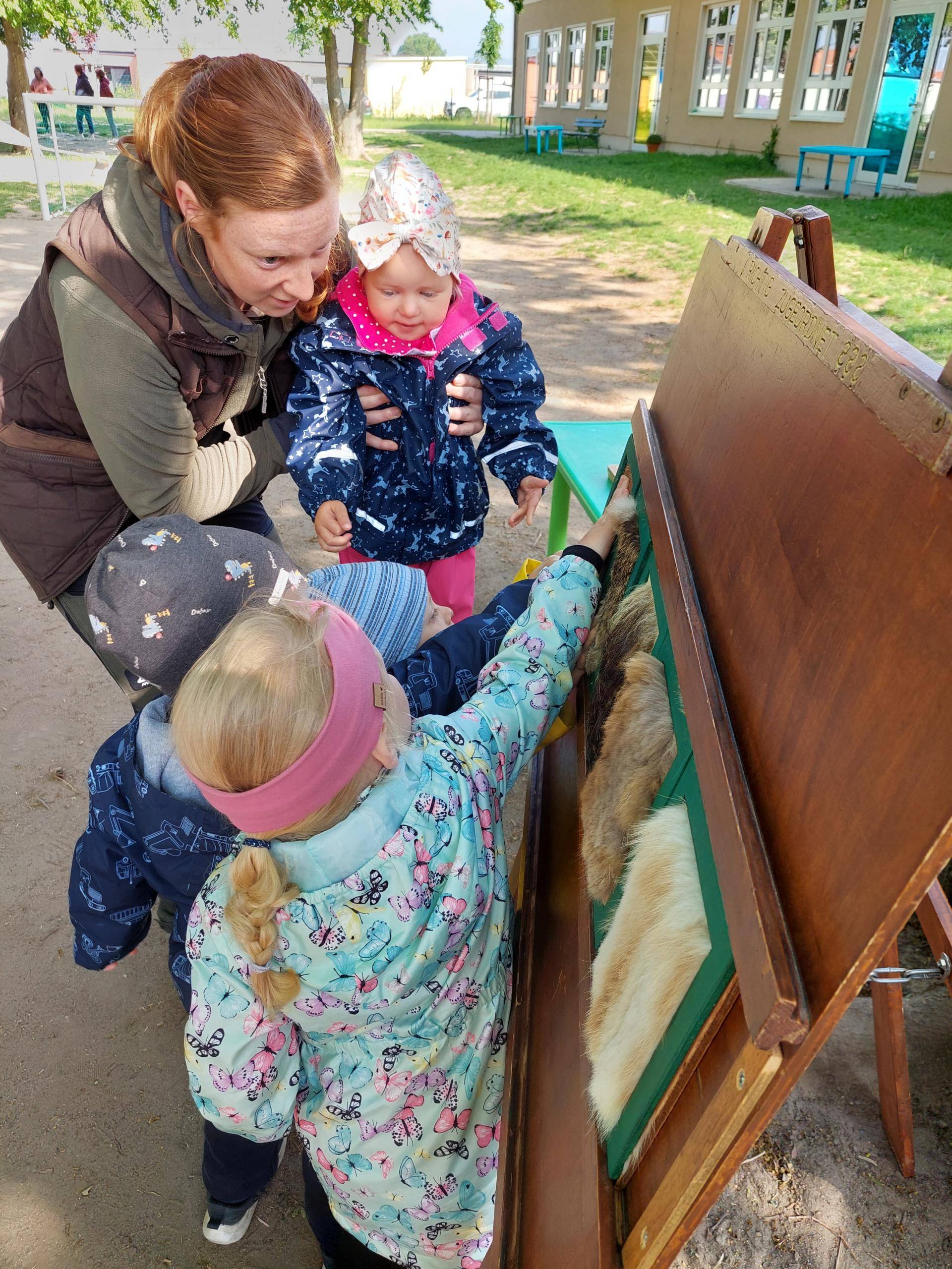 Aber dann ging es richtig los. Dabei wurde dann auch festgestellt, dass die Tiere gar nicht „echt“ waren. Das tat der Freude der Kinder aber keinen Abbruch. Denn so konnten sie die Tiere aus nächster Nähe bestaunen und sogar anfassen, Felle zuordnen und fühlen, riesige Puzzleteile sortieren und das richtige Futter für die Tiere suchen. Die Allerkleinsten der Kita gingen ganz vorsichtig über einen Barfußpfad.