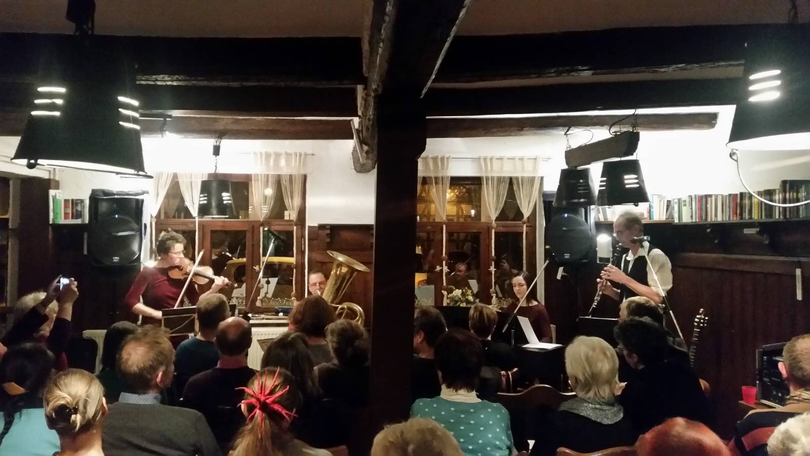 Der Schankraum des ehemaligen Gasthauses zum Schachspiel war jedes Mal mit etwa 60 Personen gut gefüllt und man sah trotz des freien Eintritts niemanden das Konzert vor dem Ende verlassen. Es gab im Gegenteil noch Nachzügler, die nach der Pause neugierig hereinkamen. Das spricht für die Künstler und das urige Ambiente und macht Lust auf die nächsten geplanten Veranstaltungen. Der Bauch des aufgestellten Spenden-Sparschweins füllte sich im Übrigen schnell und reichlich, wofür der Kulturdorfverein im Namen des Schachmuseums herzlich dankt.