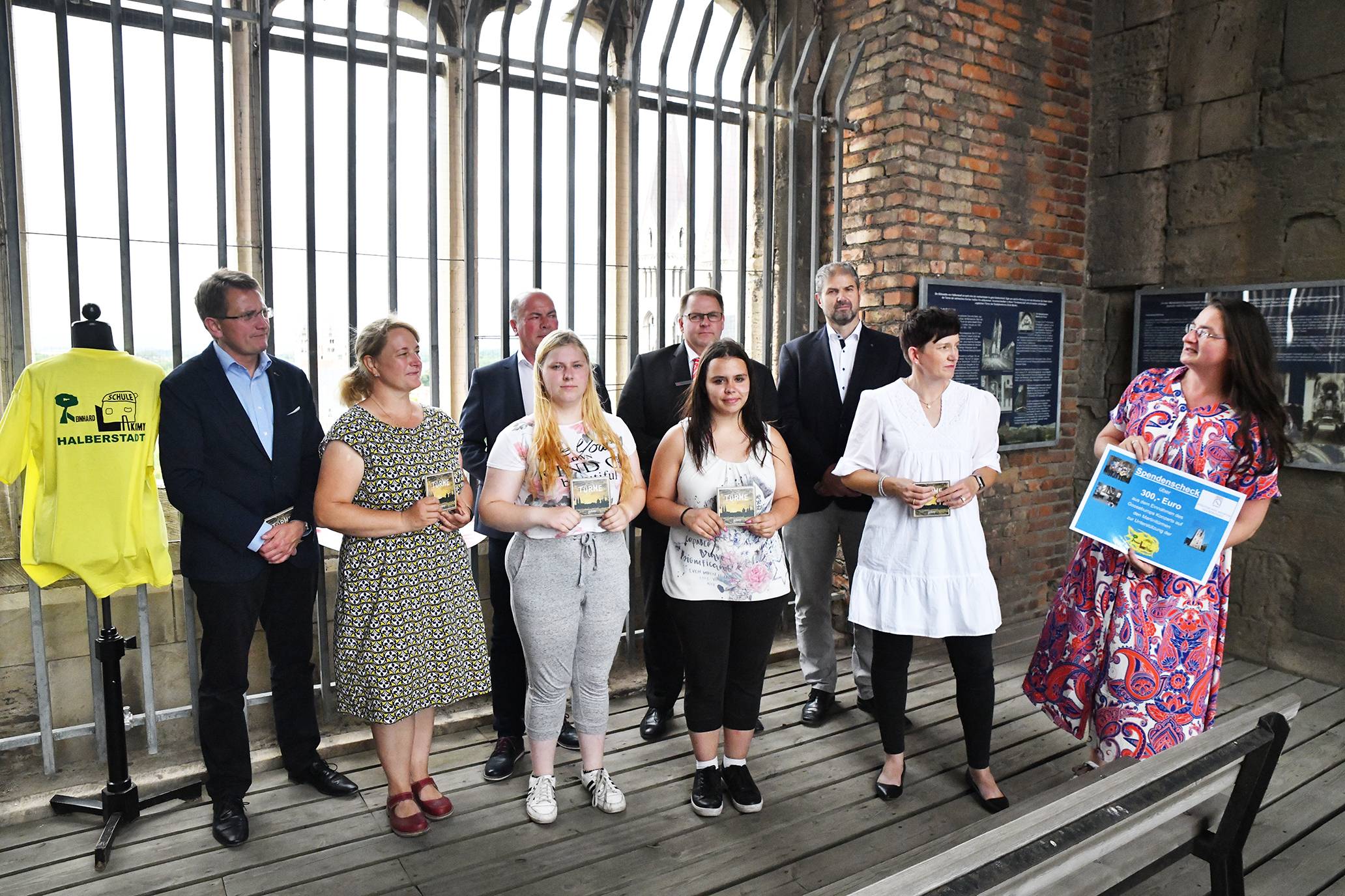 Foto: Stadt Halberstadt / Holger Wegener - Der Song „Türme“ wird auf den Martinitürmen präsentiert. v.l.n.r.: Christian Mokosch, Frau Jährchel mit Schülerinnen, Thomas Rimpler, Heiko Rudloff, Diana Hildebrandt Dr. Antje J. Gornig, anwesend.