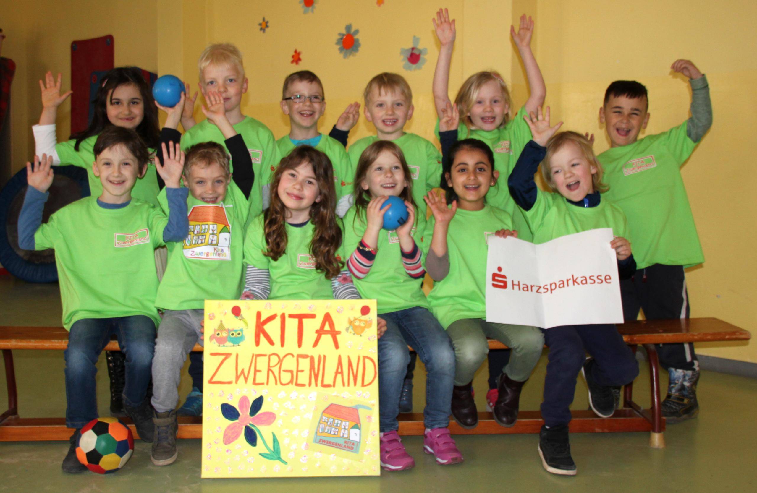FOTO: Die Kinder der Kita Zwergenland freuen sich über die T-Shirtspende der Harzsparkasse.