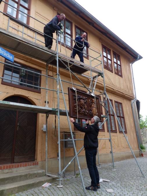 Nun ist durch die AfU Privates Bildungsinstitut GmbH eine originalgetreue Nachbildung geschaffen worden, die in Kürze durch zwei 1-Euro-Jobber als Maßnahme des AfU über dem Eingang des Hauses angebracht wird. Das Original hierzu wird sicher im Städtischen Museum aufbewahrt. Nach einer 10jährigen Sanierungsmaßnahme an dem Gebäude ist die historische Relieftafel nun der krönende Abschluss des Ganzen und ziert die Fassade an seinem originalen Platz. Damit wäre das eindrucksvoll sanierte und wiederbelebte Haus hinsichtlich der historischen Ansicht wieder komplett.