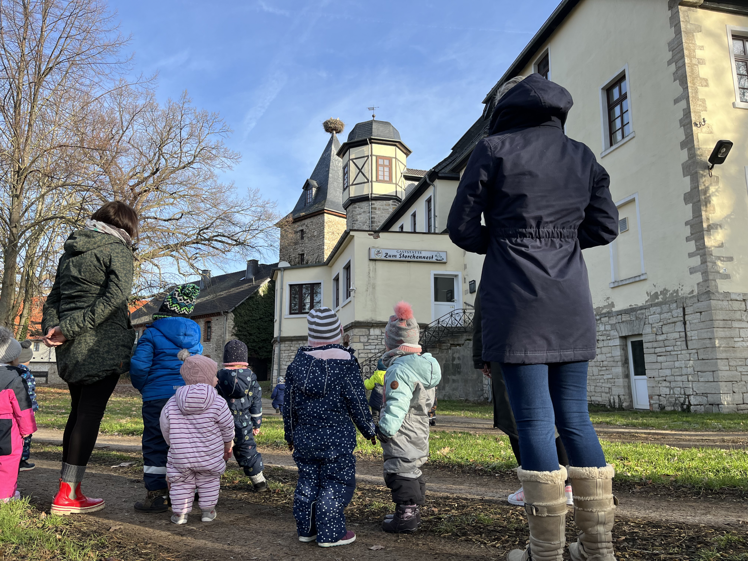 Ein Storchenpärchen ist zurück aus dem warmen Süden und leitet damit ein neues Storchenjahr für alle Kinder der Kita ein.
