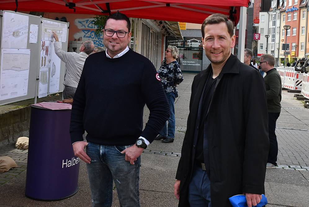 Tobias Siebert, Geschäftsführer des Planungsbüros Siebert Ingenieure GmbH, und Gerald Löhr von der Abteilung Tiefbau standen für Fragen zur Verfügung. Das markante „H“ als Blickfang des „neuen“ Breiten Wegs erregte besonderes Interesse