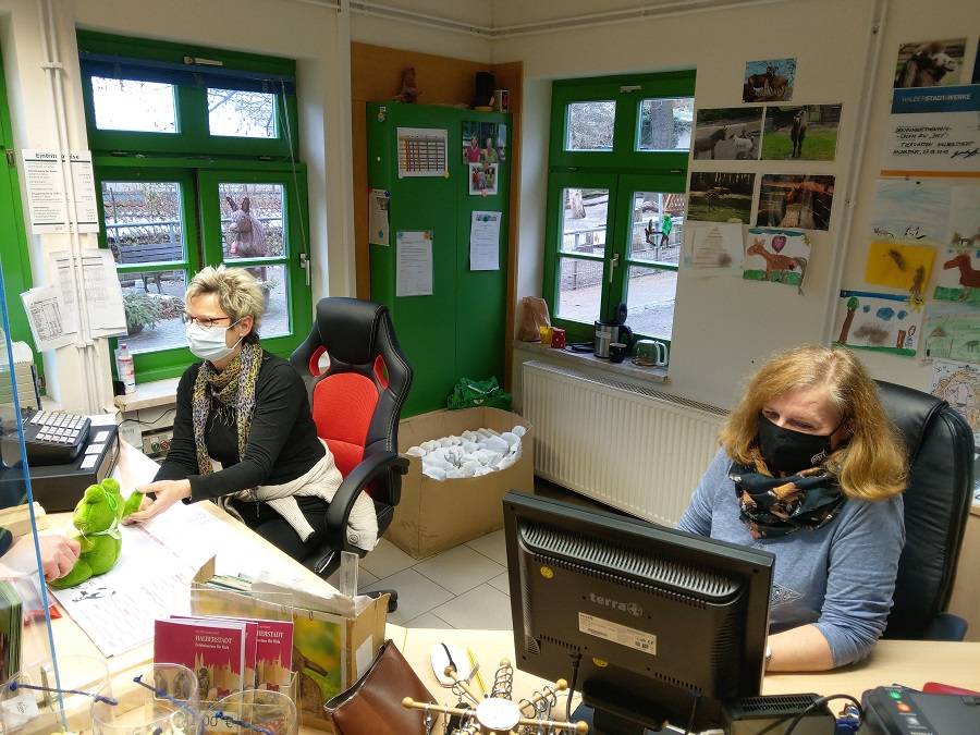 Die Museums-Aufsichtskräfte Sylvia Züfle und Jana Baller begrüßen die Besucher des Tiergartens im Kassenhäuschen.