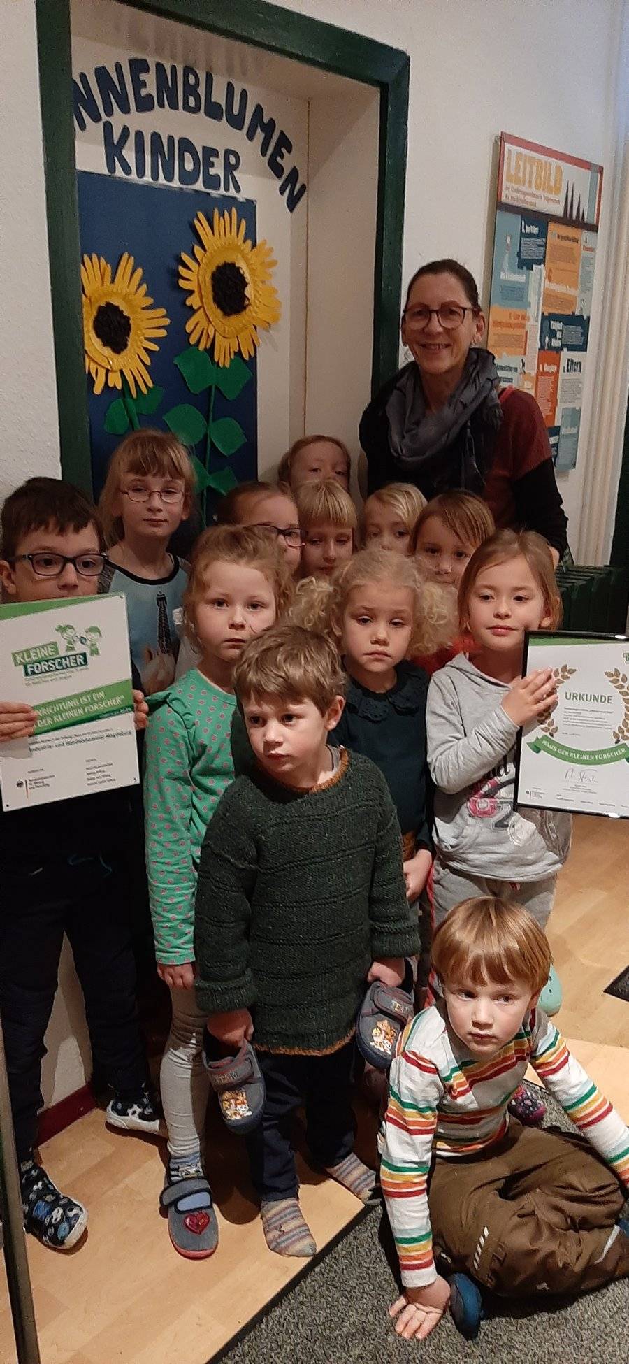 Foto: Die Kinder der Kita Holzbergwichtel mit der Urkunde „Haus der kleinen Forscher“. (Foto: Kita Holzbergwichtel/Stadt Halberstadt)