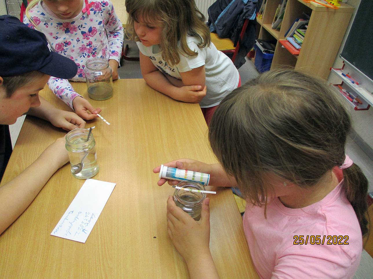 Eine spannende Aufgabe war es, verschiedene Bodenproben an unterschiedlichen Orten in Ströbeck zu sammeln und zu analysieren. In Gläsern wurden die Proben mit Wasser angereichert, um mithilfe von Teststreifen die Bodenproben auf ihren Säurewert und ihre alkalischen Verbindungen zu überprüfen.
