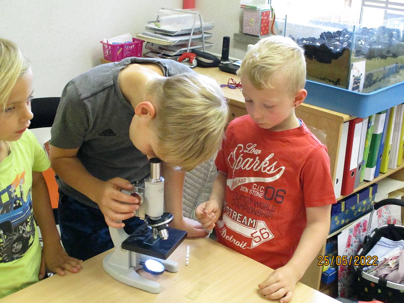 Interessant war es, einige Bodenproben unter dem Mikroskop anzuschauen. Erstaunt waren die Kinder, als sie entdeckten, dass Sand – und Erdkörner unterschiedliche Strukturen aufweisen.