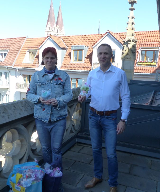 HomeAm Freitag den 29. Mai 2020 besuchte Frau Anja Schuchmann den Oberbürgermeister Andreas Henke im Rathaus der Stadt Halberstadt. Sie brachte eine Überraschung mit. Frau Schuchmann übergab dem Oberbürgermeister 80 selbst gebastelte Schmetterlinge. Diese sollen an die Mitarbeiter und Mitarbeiterinnen der Stadt Halberstadt verteilt werden. Die kleinen Präsente sollen den Mitarbeiterinnen und Mitarbeitern eine kleine Freude machen.