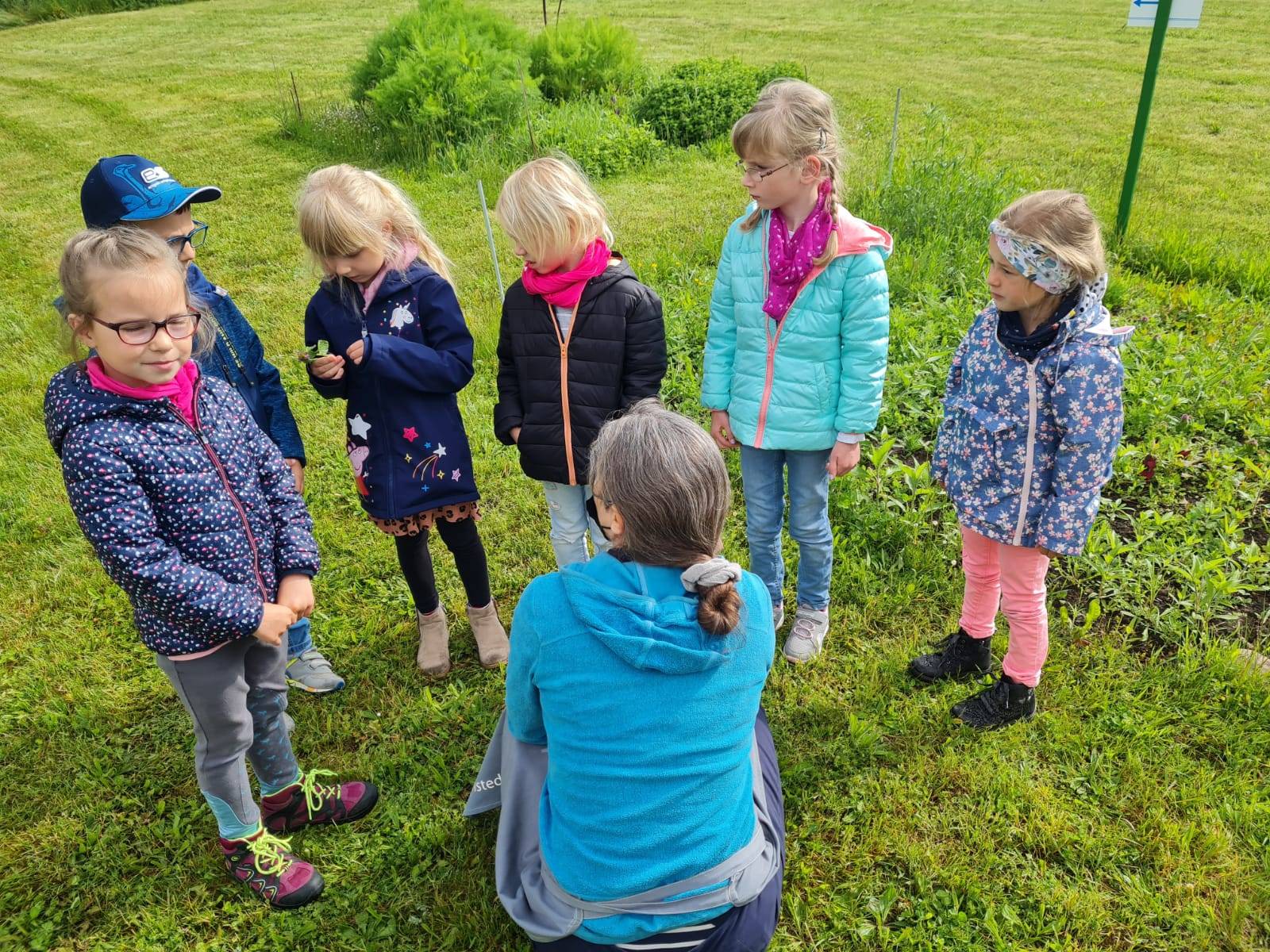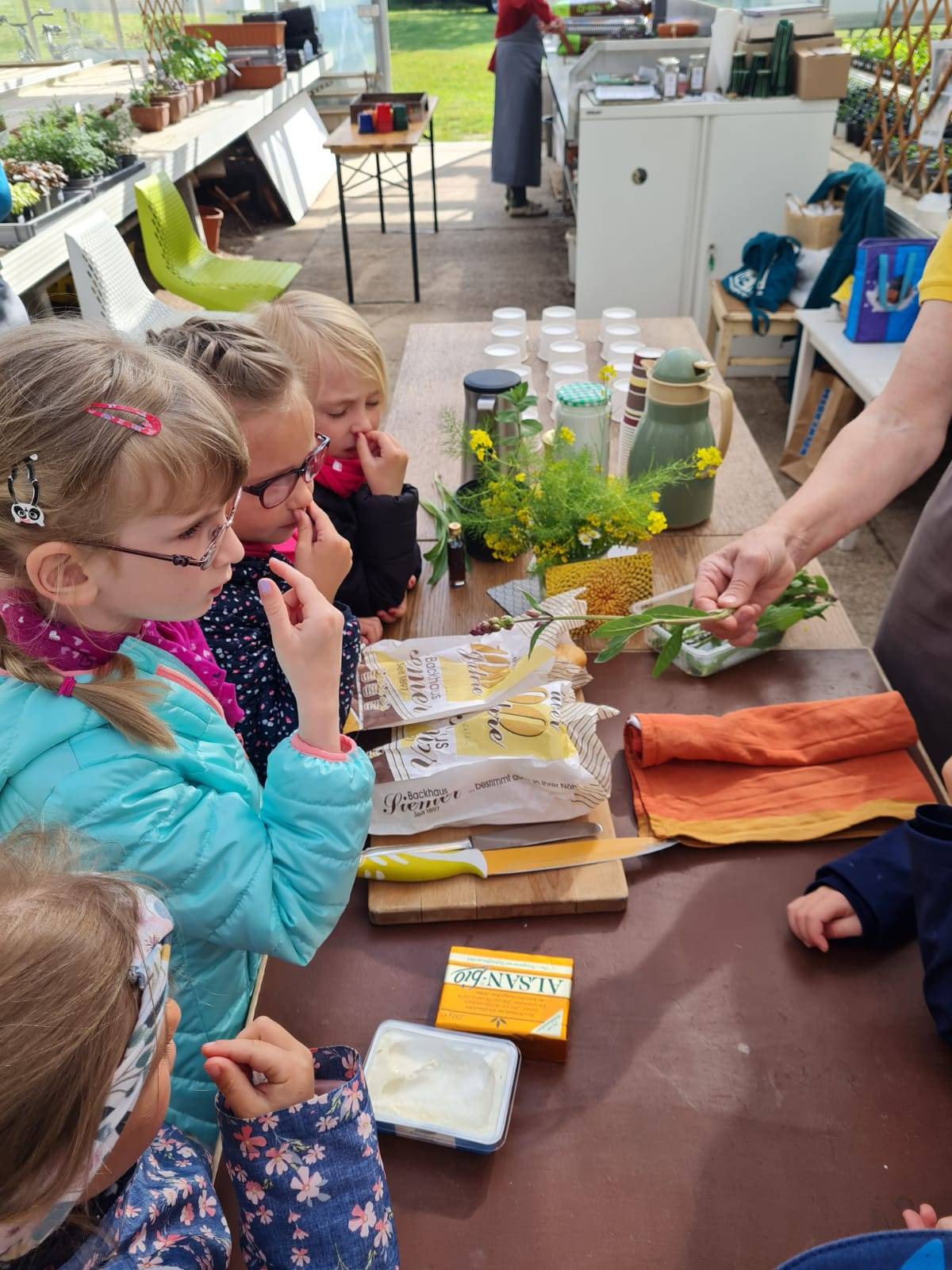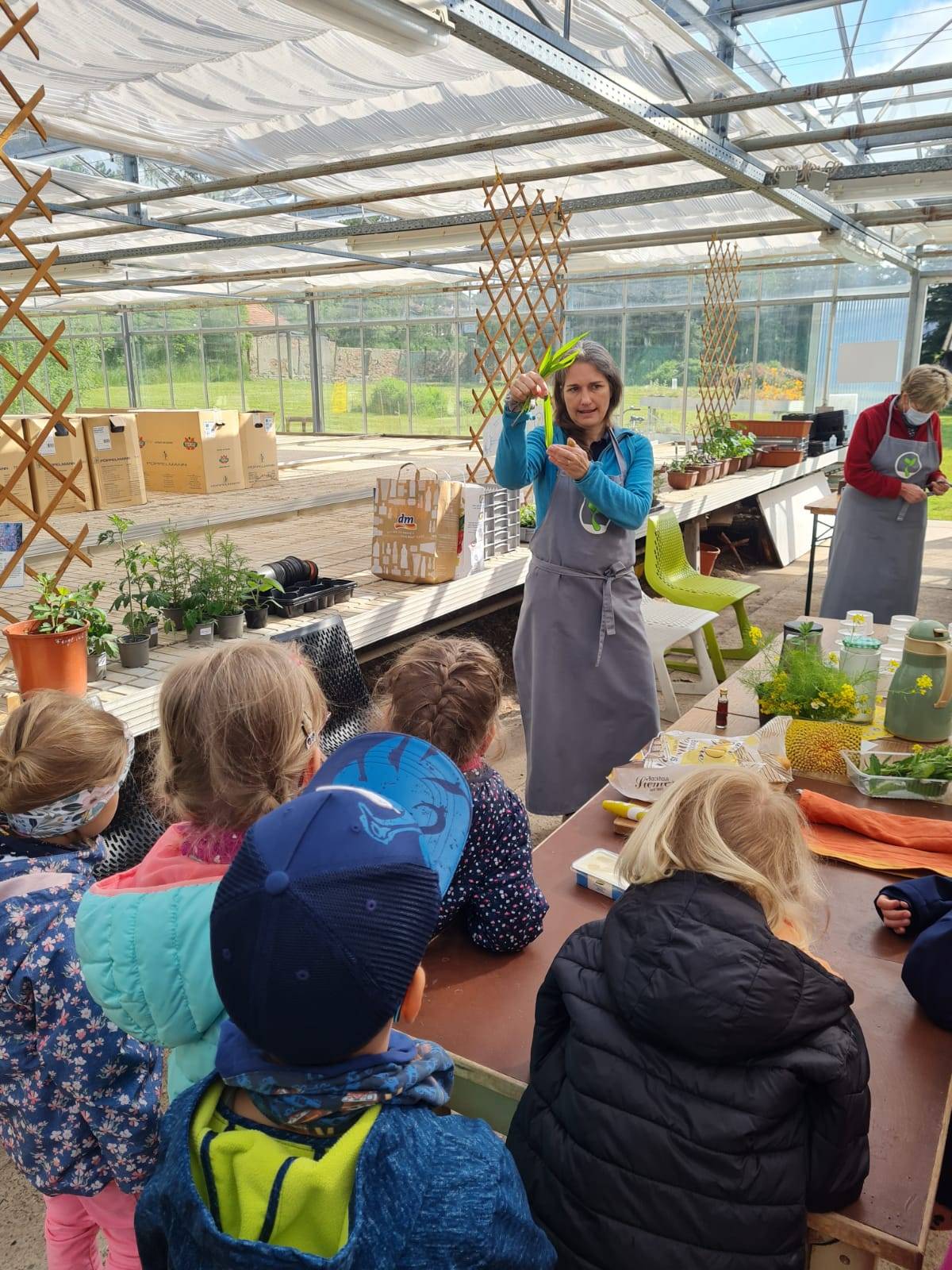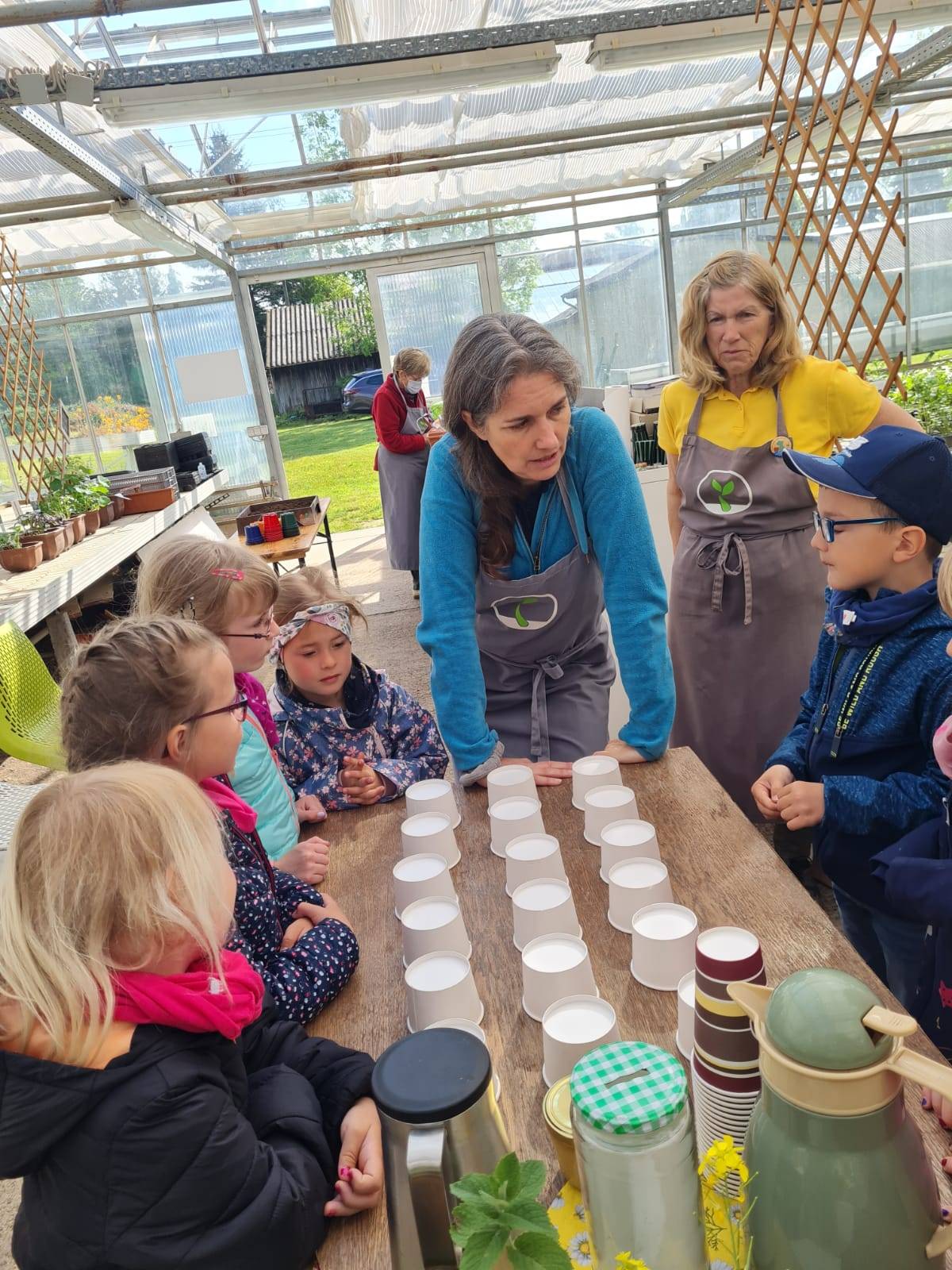 Zunächst wurden die Kinder mit verschiedenen Kräutern vertraut gemacht, die im Gewächshaus des Vereins groß werden und auch auf den weitläufigen Beeten unter freiem Himmel gedeihen. Und das sind wirklich viele, denn gerade grünt und blüht es sehr üppig.