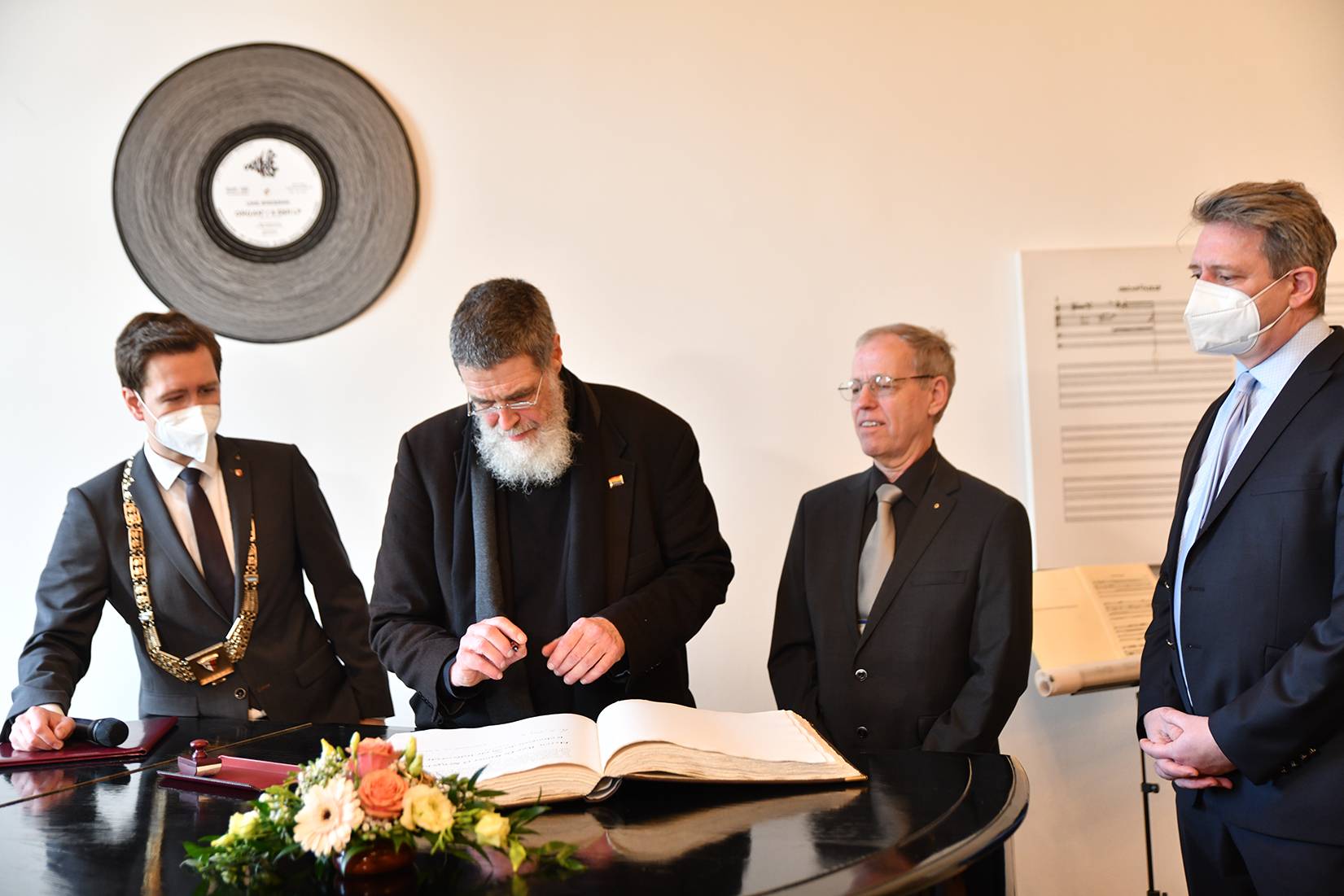Bild: Stadt Halberstadt - Kulturpreisträger Prof. Dr. Rainer O. Neugebauer trägt sich in das Goldene Buch der Stadt Halberstadt ein – v.l.n.r.: Oberbürgermeister Daniel Szarata, Prof. Dr. Rainer O. Neugebauer, Stadtratspräsident Dr. Volker Bürger und Kulturstaatssekretär Dr. Sebastian Putz