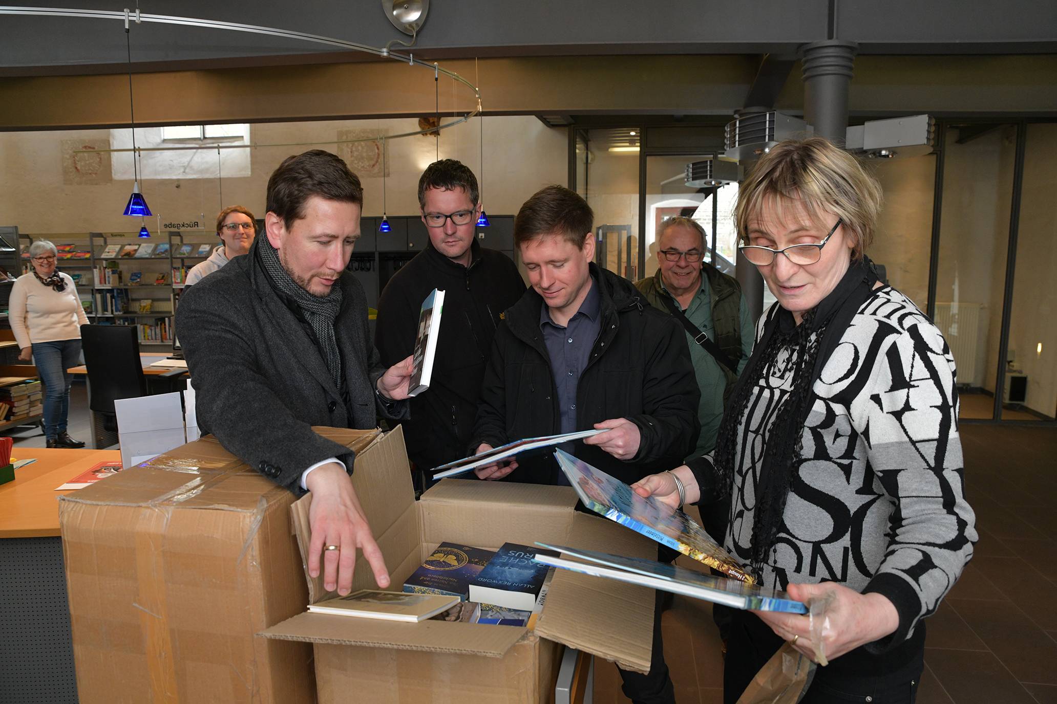 Oberbürgermeister Daniel Szarata und Bürgermeister Marcus Weise haben gemeinsam mit der Leiterin der Stadtbibliothek, Birgit Sommer, und ihrem Team die Kartons voller Bücher für Leser jeden Alters begutachtet.