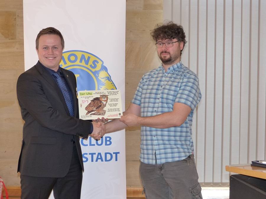 Der Lons Club-Präsident Bastian Herbst überreicht eines der 40 gesponserten neuen Schilder an Tiergartenleiter David Neubert.
