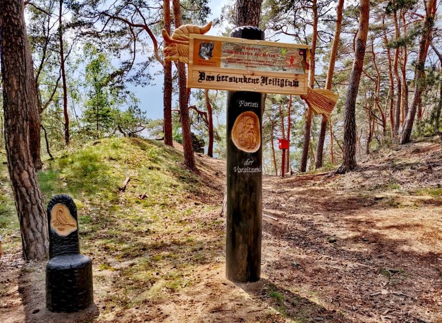 Mit dem Aufstellen von außergewöhnlichen, handgefertigten Hinweisschildern aus großen, geschnitzten Holzstämmen soll das Auffinden und die Information zu den Punkten des "versunkenen Heiligtums" verbessert werden. In die beeindruckenden Holzstelen wurden Motive nordischer Gottheiten und die entsprechenden Sternzeichen geschnitzt. Die Schnitzarbeiten führte die AFU Privates Bildungsinstitut GmbH im Rahmen einer von der KoBa Jobcenter Landkreis Harz finanzierten Maßnahme durch.
