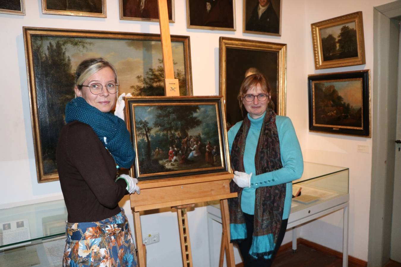 Yvonne Strengmann, Leiterin der Halberstädter Fielmann-Filiale, überreichte dem Gleimhaus ein um 1750 von einem unbekannten Künstler gemaltes Gemälde. Das Bild im französischen Stil zeigt eine heitere Gesellschaft, die bei einem Ausflug ins Grüne eine Rast einlegt und dabei Wein trinkt und angeregt plaudert.