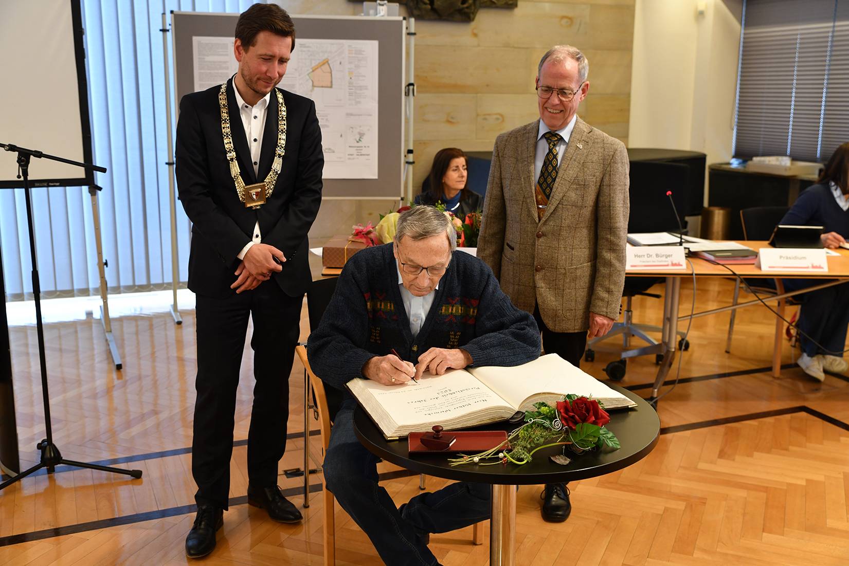 Volker Warnecke trug sich im Anschluss an die Auszeichnung durch Stadtratspräsident Dr. Bürger und Oberbürgermeister Daniel Szarata in das Goldene Buch der Stadt ein.