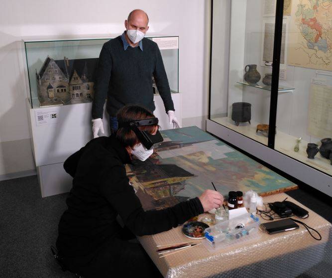Restauratorin Roswitha Dreysse und Sammlungsmitarbeiter André Pohl bei den ersten Reinigungsarbeiten am Gemälde im Städtischen Museum