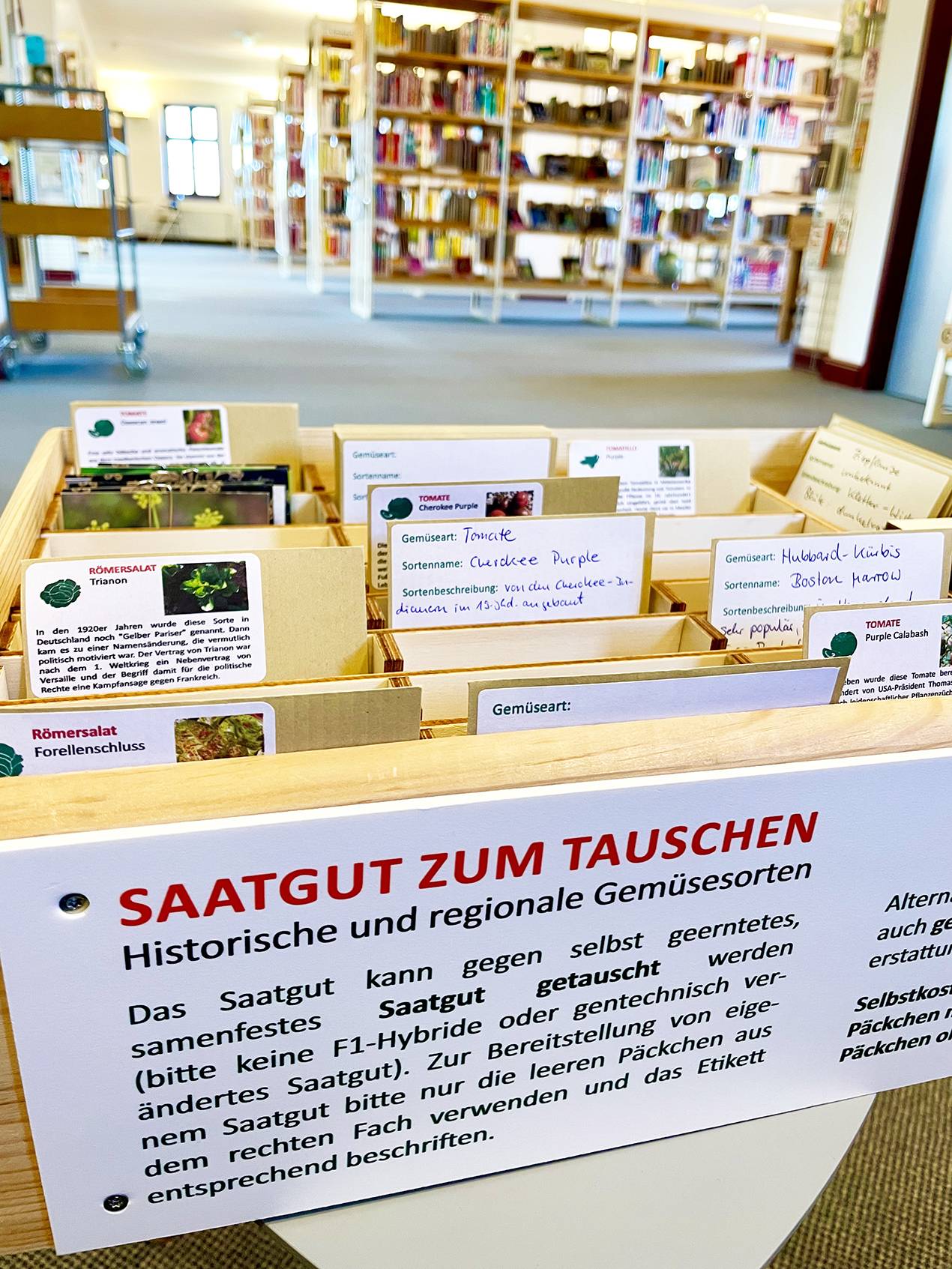 Für eine kleine Spende konnten die Saatguttütchen „ausgeliehen“ und im Garten ausgesät werden. Bei der Ernte sollten die Samen gesammelt und getrocknet werden und anschließend wieder in der Bibliothek abgegeben werden.