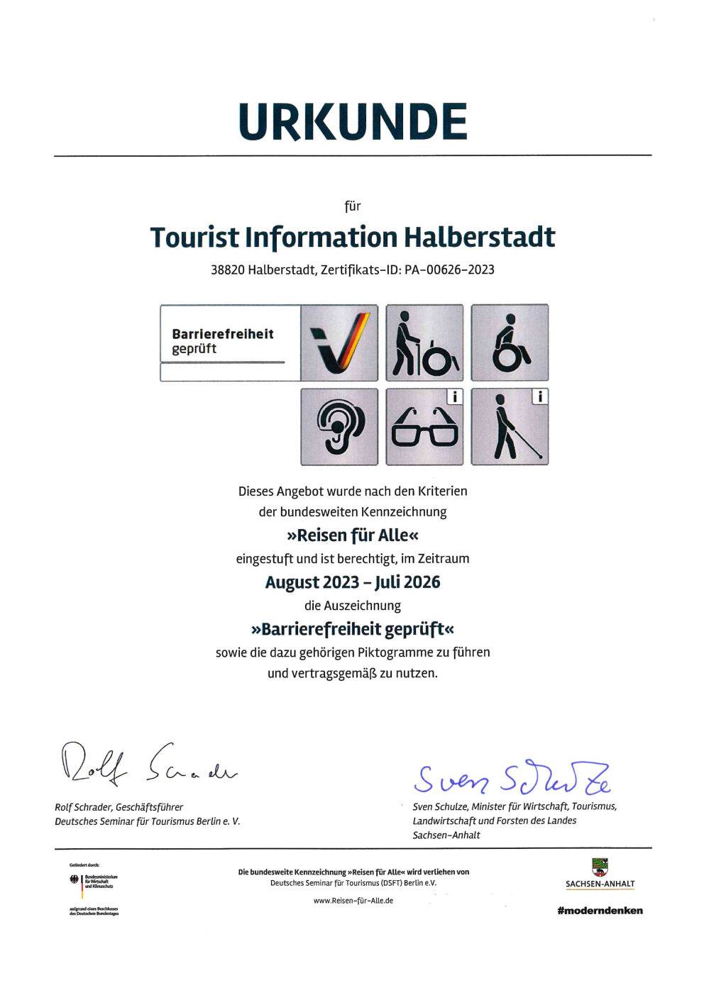 Dieses Zertifikat konnte nun erneut erfolgreich verteidigt werden. "Wir wollen eine zuverlässige Grundlage für Reiseentscheidungen dieser Zielgruppe schaffen und zeigen, dass Halberstadt einen Besuch wert ist" so die Leiterin der Tourist Information, Christiane Strohschneider.