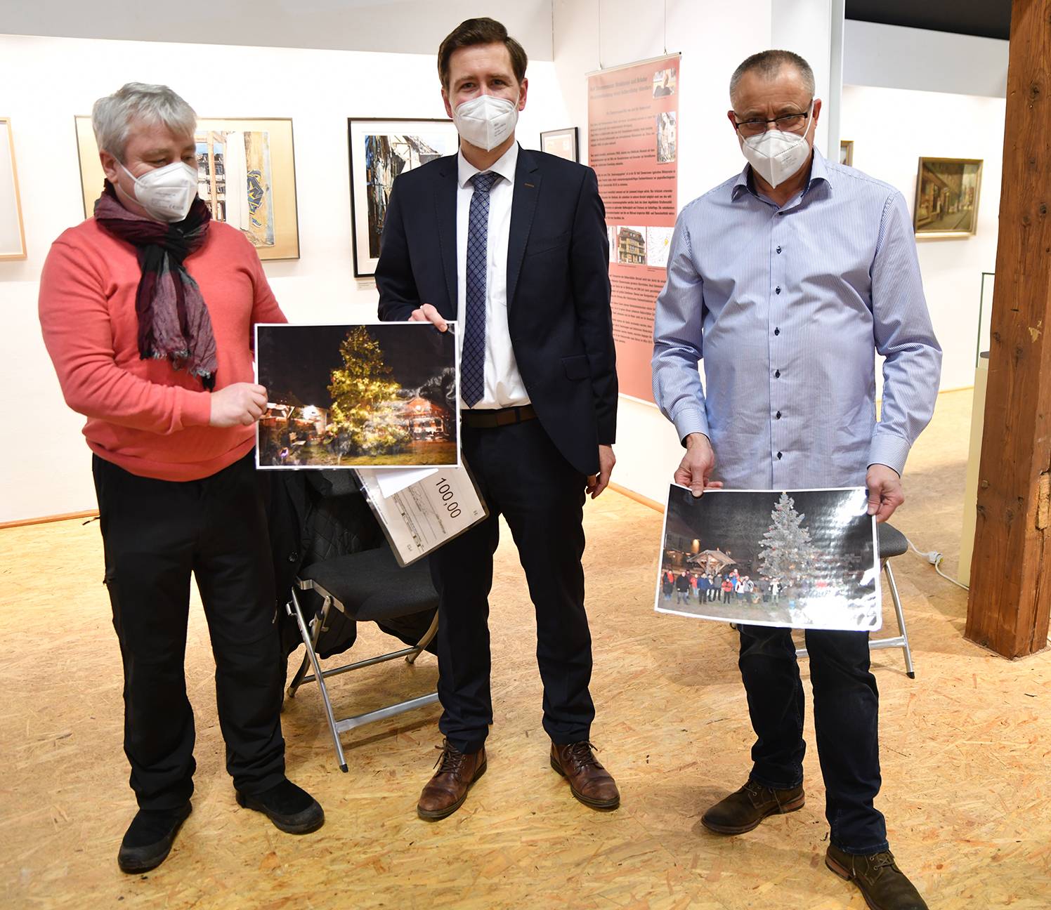 Bild: Stadt Halberstadt - Oberbürgermeister Daniel Szarata (l.), Auschussvorsitzender Dieter Kühn (r.) freuen sich mit Ortsbürgermeister Holger Werkmeister (m.) über die Auszeichnung „Schönster Weihnachtsbaum der Ortsteile“